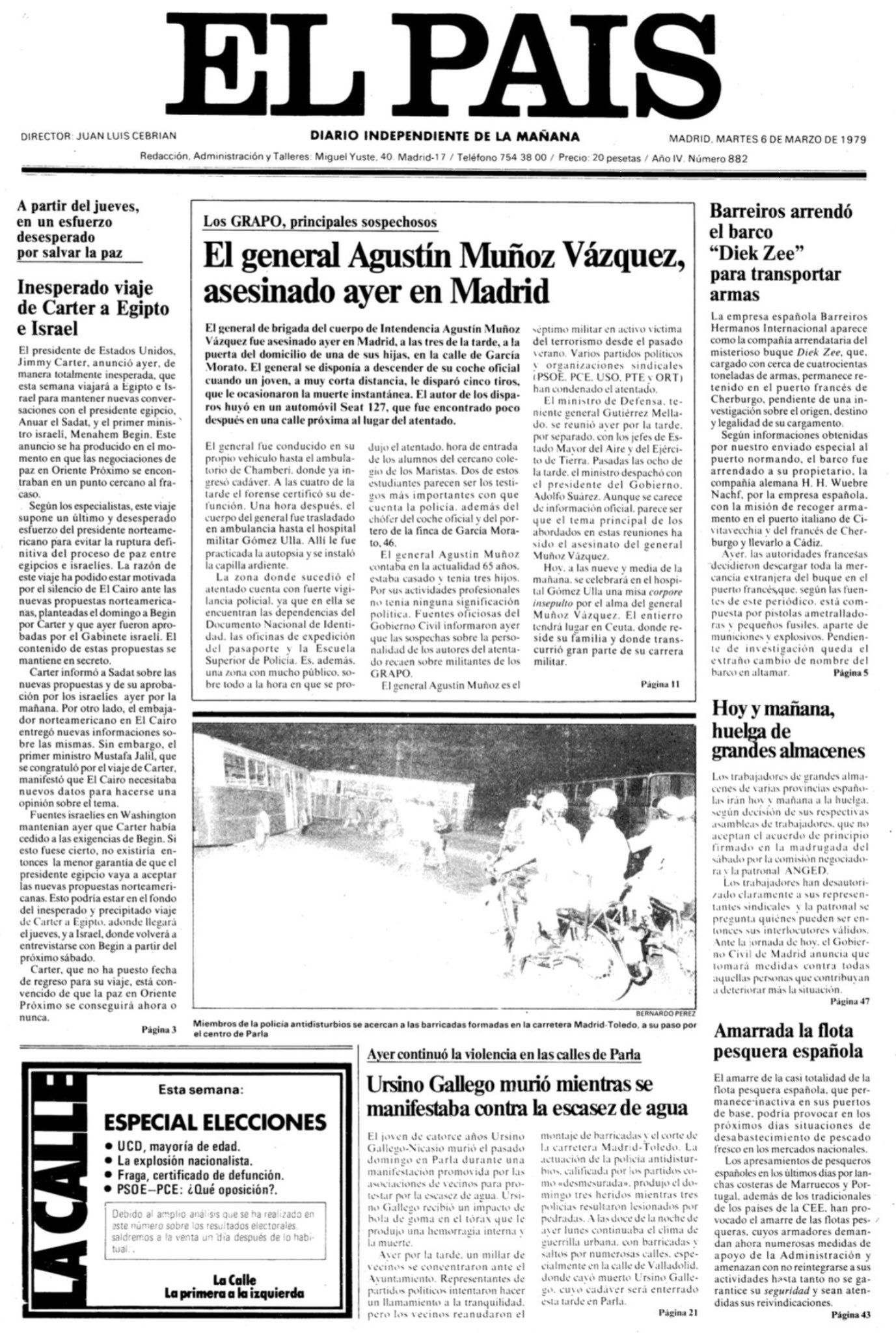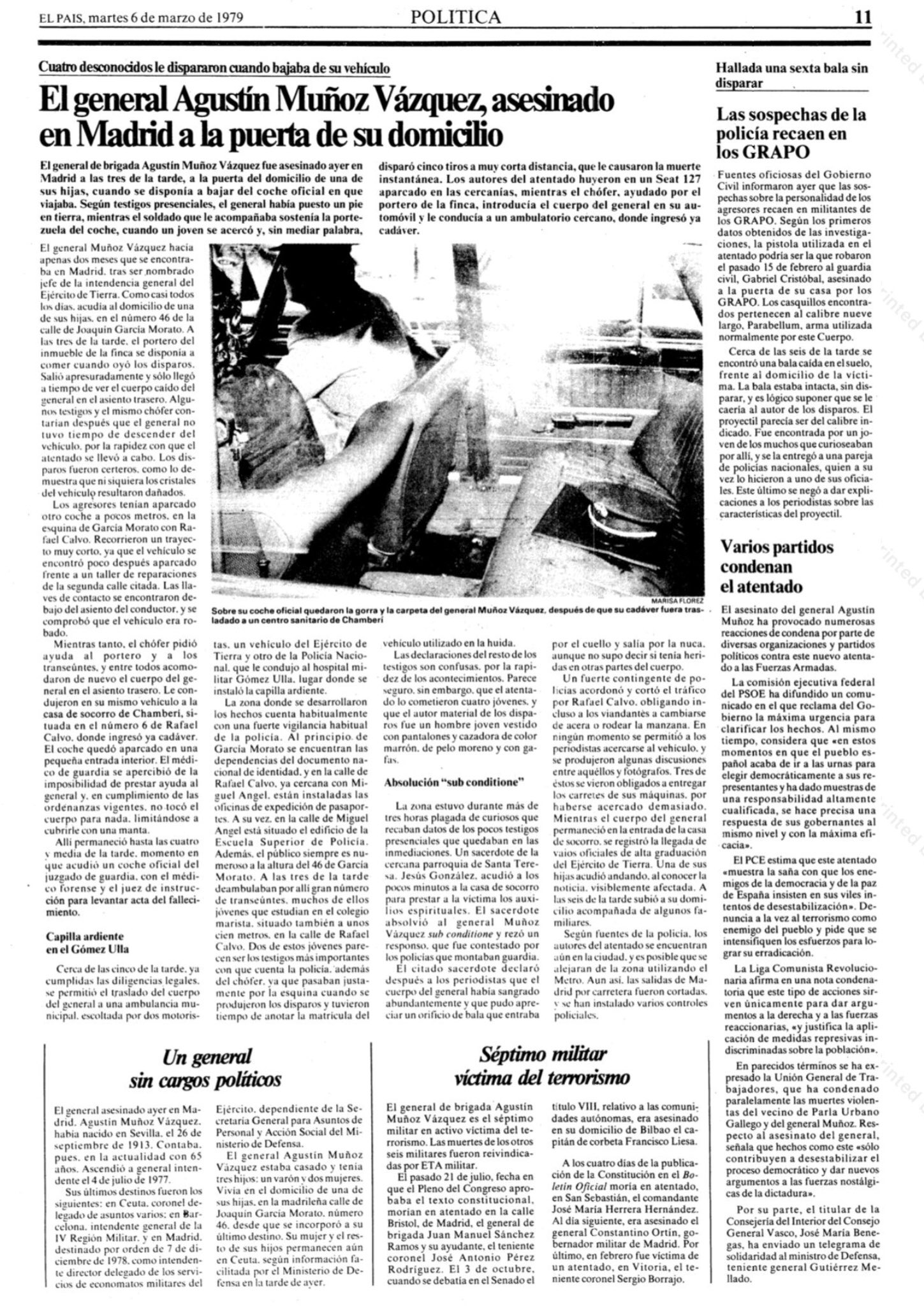 Hacia las 15.00, el general de Intendecia del Ejército de Tierra Agustín Muñoz Vázquez llegó al domicilio de una de sus hijas en el número 49 de la calle Joaquín García Morato. El conductor del coche oficial se bajó a abrirle la puerta y, cuando el militar apenas había puesto un pie sobre el asfalto, un individuo le disparó cinco tiros en la cabeza. El chófer y el portero del edificio lo trasladaron a una casa de socorro de la calle Rafael Calvo, en Chamberí, donde el militar ya ingresó cadáver.