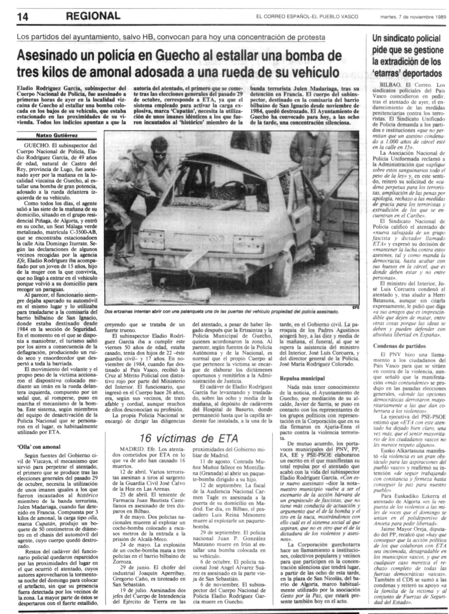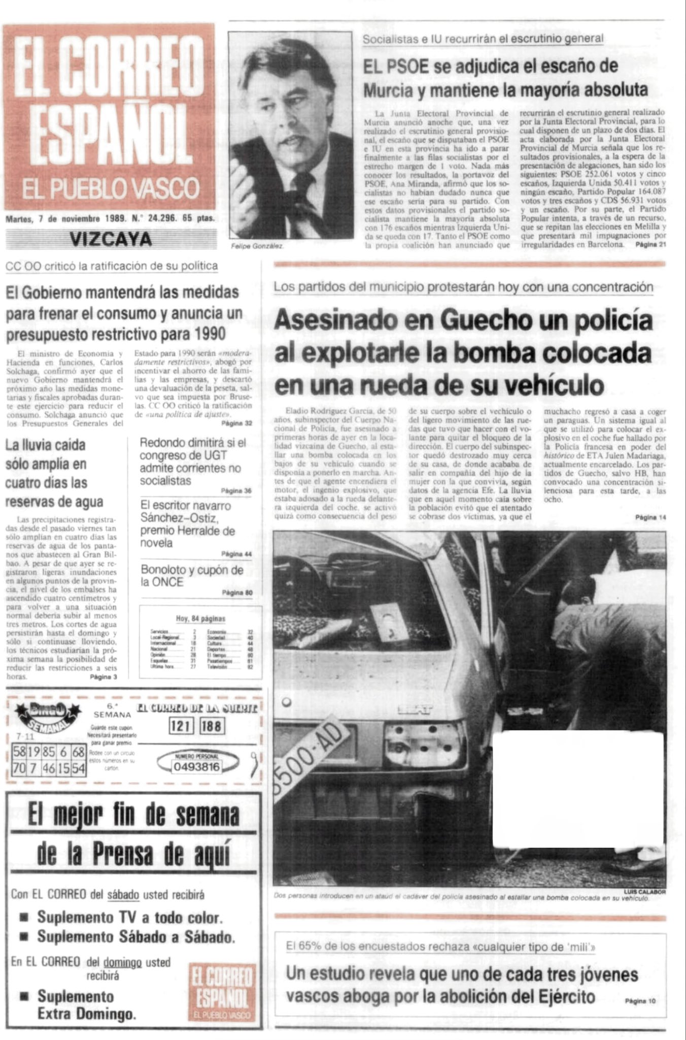 Una semana después de las elecciones legislativas del 29 de octubre de 1989, en las que el PSOE revalidó su mayoría absoluta, la banda terrorista ETA asesinaba en Guecho (Vizcaya) al subinspector de Policía ELADIO RODRÍGUEZ GARCÍA mediante una bomba-lapa colocada en los bajos de su vehículo.