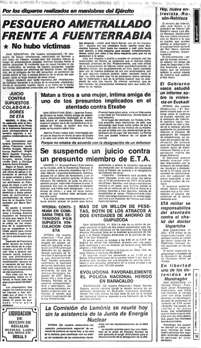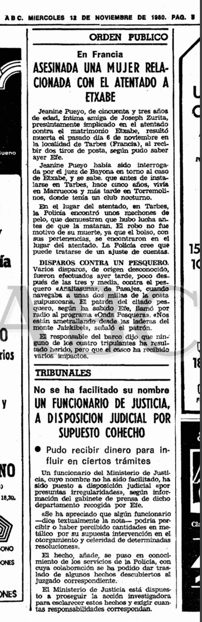 El 6 de noviembre de 1980 la banda terrorista ETA asesinaba en Tarbes (Francia) a la ciudadana francesa JEANINE PUEYO, novia de Josep Zurita, sospechoso de pertenecer a grupos extremistas y de haber participado en el atentado contra el exdirigente de ETA Juan José Etxabe el 4 de julio de 1978 en San Juan de Luz.