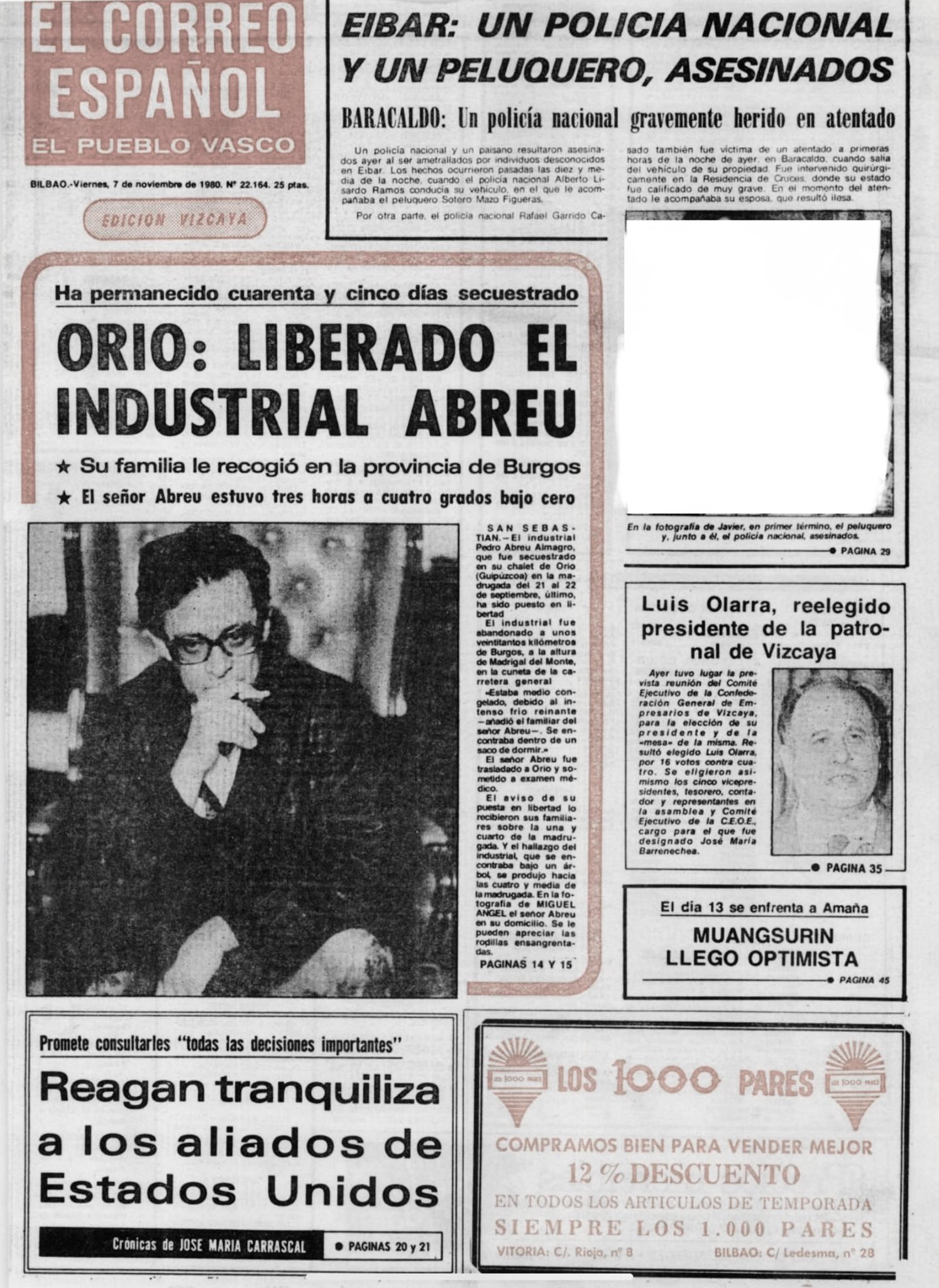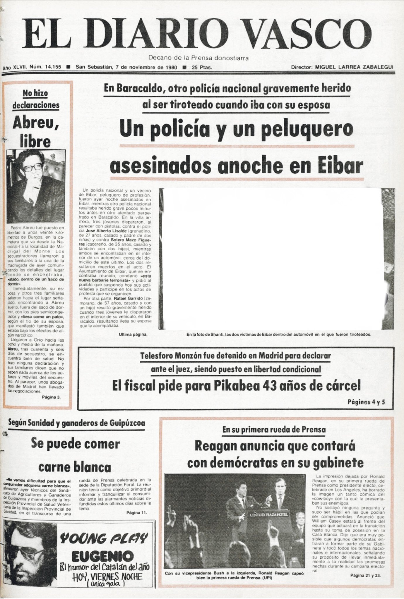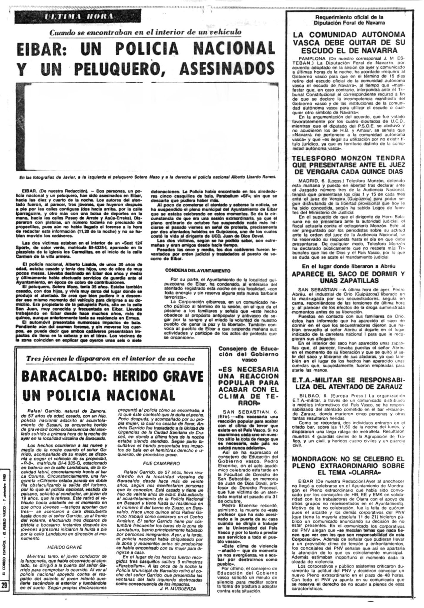 Pasadas las diez de la noche del jueves 6 de noviembre de 1980, tres miembros de la banda terrorista ETA asesinaban a tiros en Éibar al policía nacional JOSÉ ALBERTO LISALDE RAMOS y a su amigo, el peluquero SOTERO MAZO FIGUERAS. Los dos amigos salían del domicilio de Sotero y se disponían a subirse en un vehículo Seat 124, propiedad del agente de Policía.