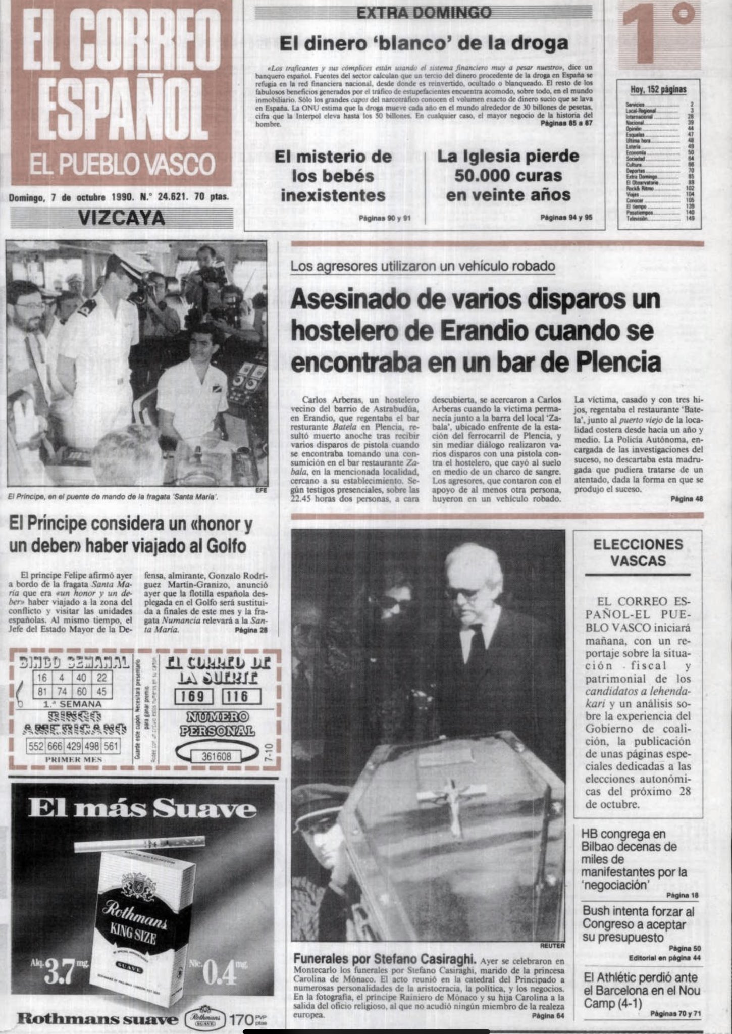Un año después, el 6 de octubre de 1990, la banda terrorista ETA asesinaba en un bar de Plencia (Vizcaya) al empresario CARLOS ARBERAS ARROYO, que regentaba el restaurante Batela en esa localidad. El atentado terrorista se cometía horas después de que miles de personas convocadas por Herri Batasuna (HB) pidiesen en Bilbao la negociación entre ETA y el Gobierno como el camino para conseguir la paz en el País Vasco.