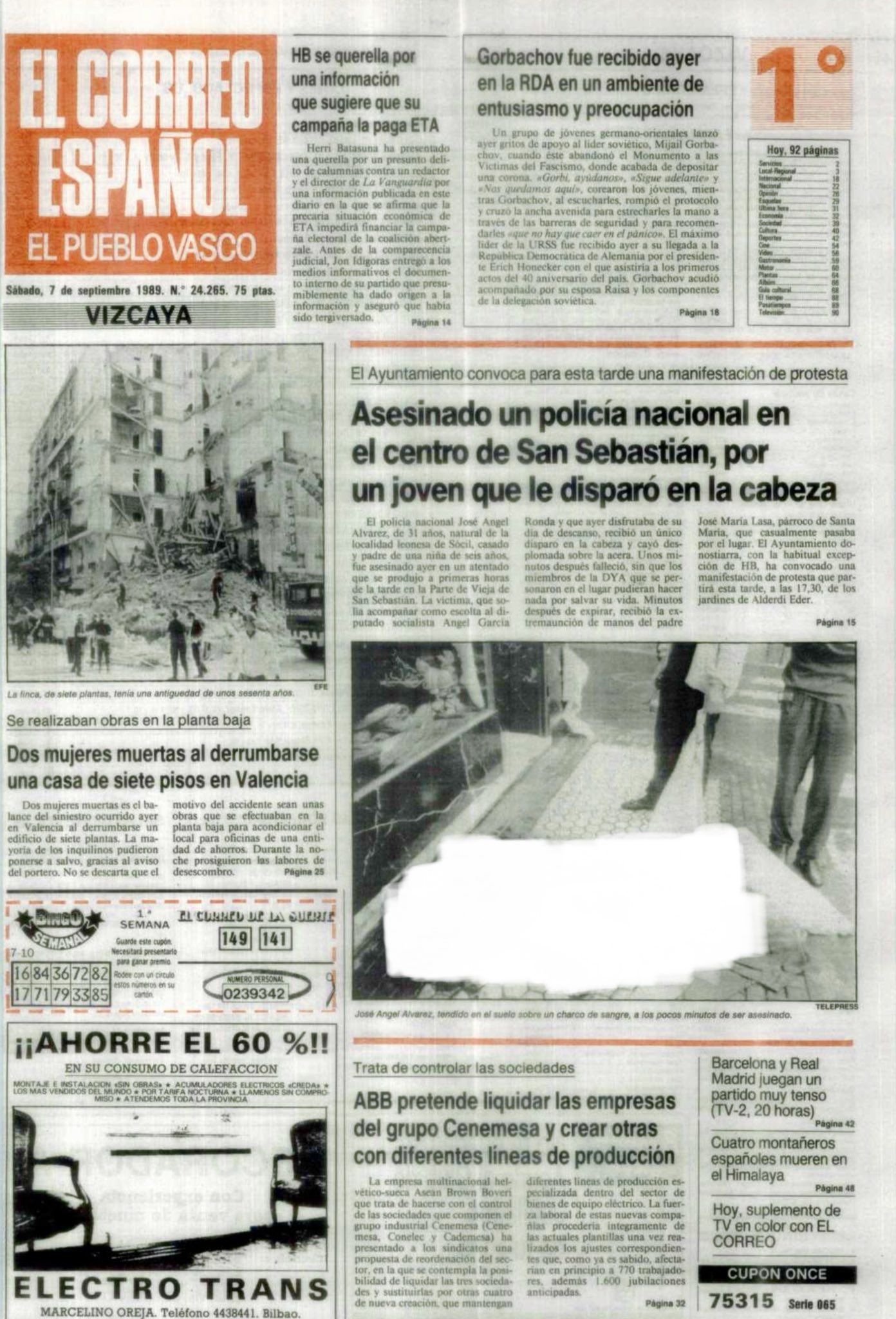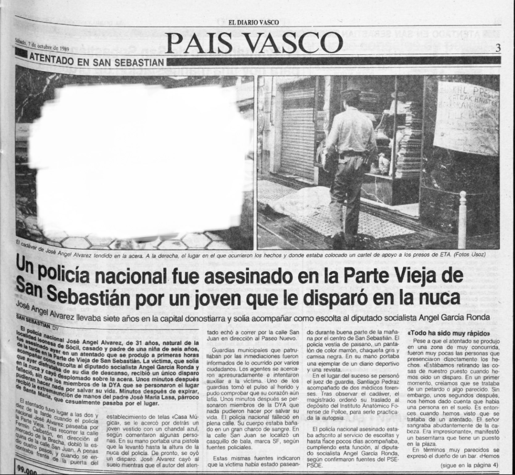 A las dos y diez de la tarde del 6 de octubre de 1989, el asesino de la banda terrorista ETA Francisco Javier Balerdi Ibarguren, empleado del grupo municipal de Herri Batasuna en el Ayuntamiento, asesinaba en San Sebastián, de un disparo en la nuca, al policía nacional JOSÉ ÁNGEL ÁLVAREZ SUÁREZ mientras paseaba por el Casco Viejo de la ciudad, cerca del céntrico mercado donostiarra de la Brecha.