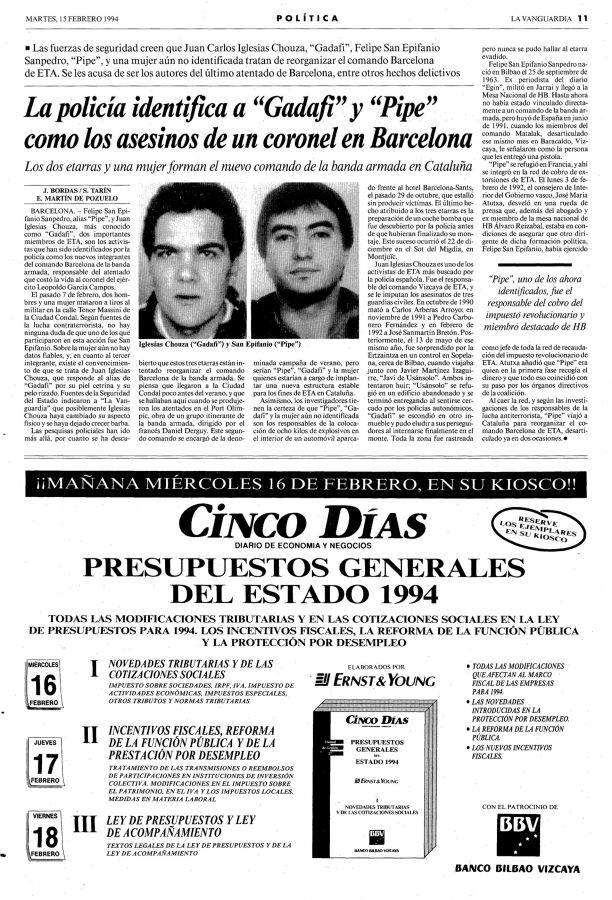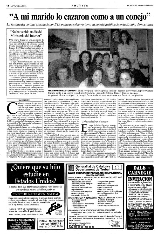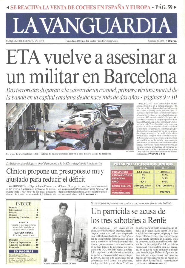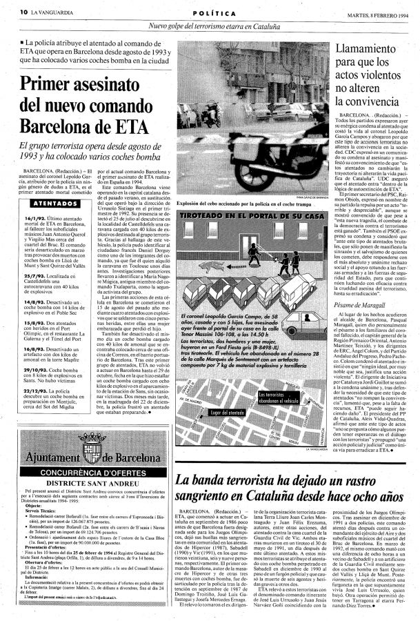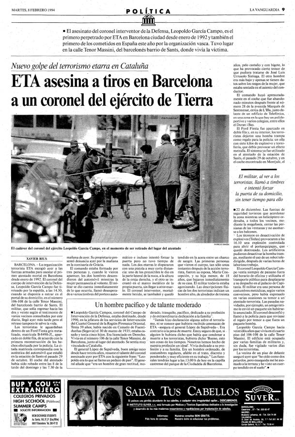 El 7 de febrero de 1994 la banda terrorista ETA asesinaba en Barcelona de un tiro en la nuca el coronel de Infantería del Ejército de Tierra LEOPOLDO GARCÍA CAMPOS.