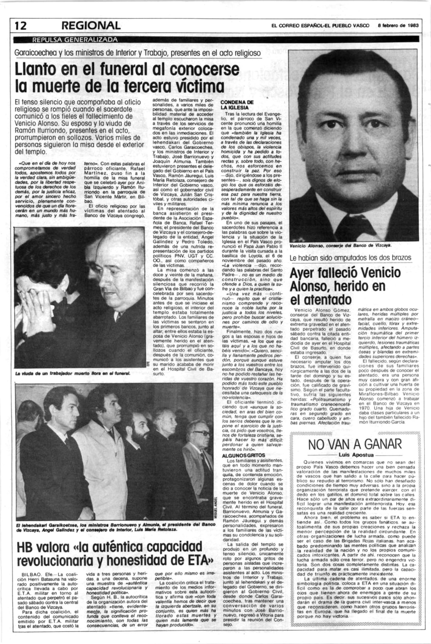 El 7 de febrero de 1983 fallecía en el Hospital de Basurto BENICIO ALONSO GÓMEZ como consecuencia de las gravísimas heridas que sufrió en el atentado cometido dos días antes en la sede del Banco de Vizcaya de la plaza de España de Bilbao.