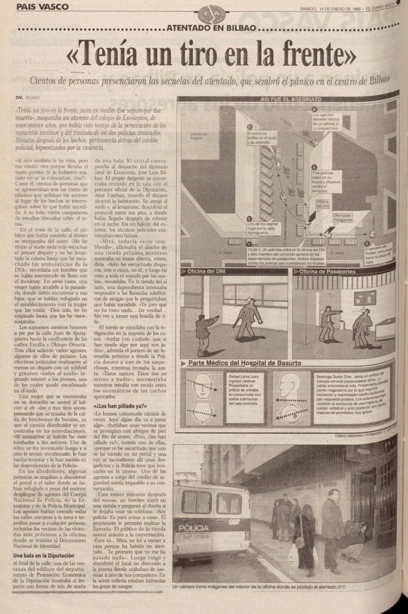 El 7 de marzo de 2003 fallecía el policía nacional DOMINGO DURÁN DÍEZ, tras permanecer ocho largos años de agonía postrado en una cama. Había quedado tetrapléjico como consecuencia del atentado del que fue víctima el 13 de enero de 1995 en Bilbao en el que falleció en el acto su compañero Rafael Leiva Loro. Ambos custodiaban unas oficinas de expedición del DNI y Pasaportes en Bilbao.