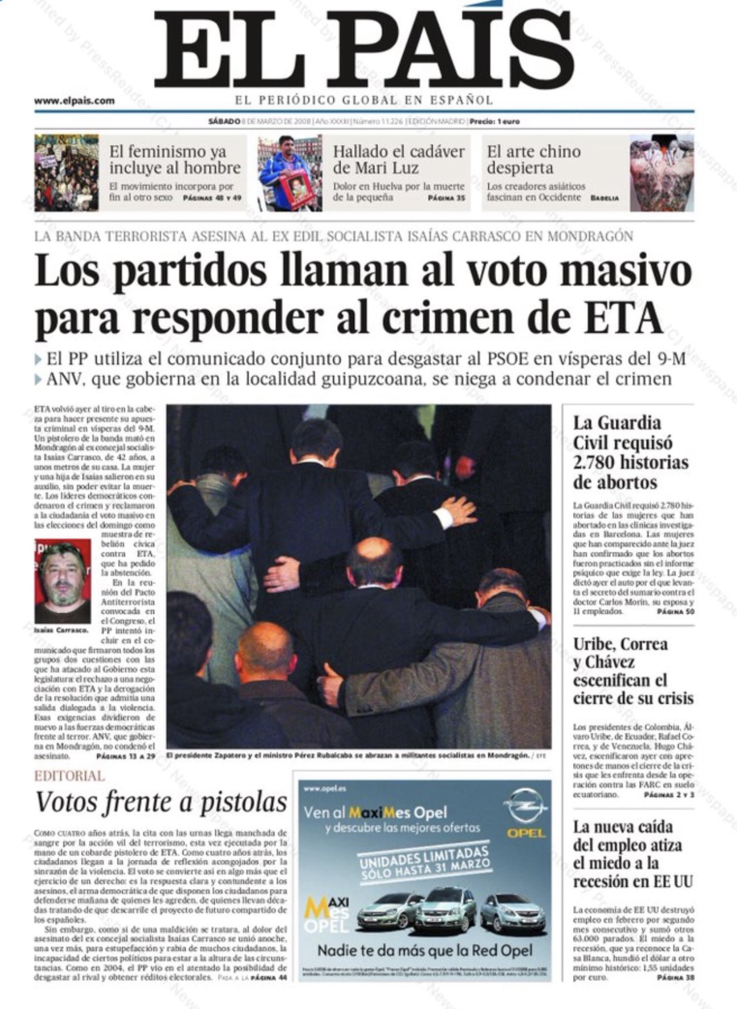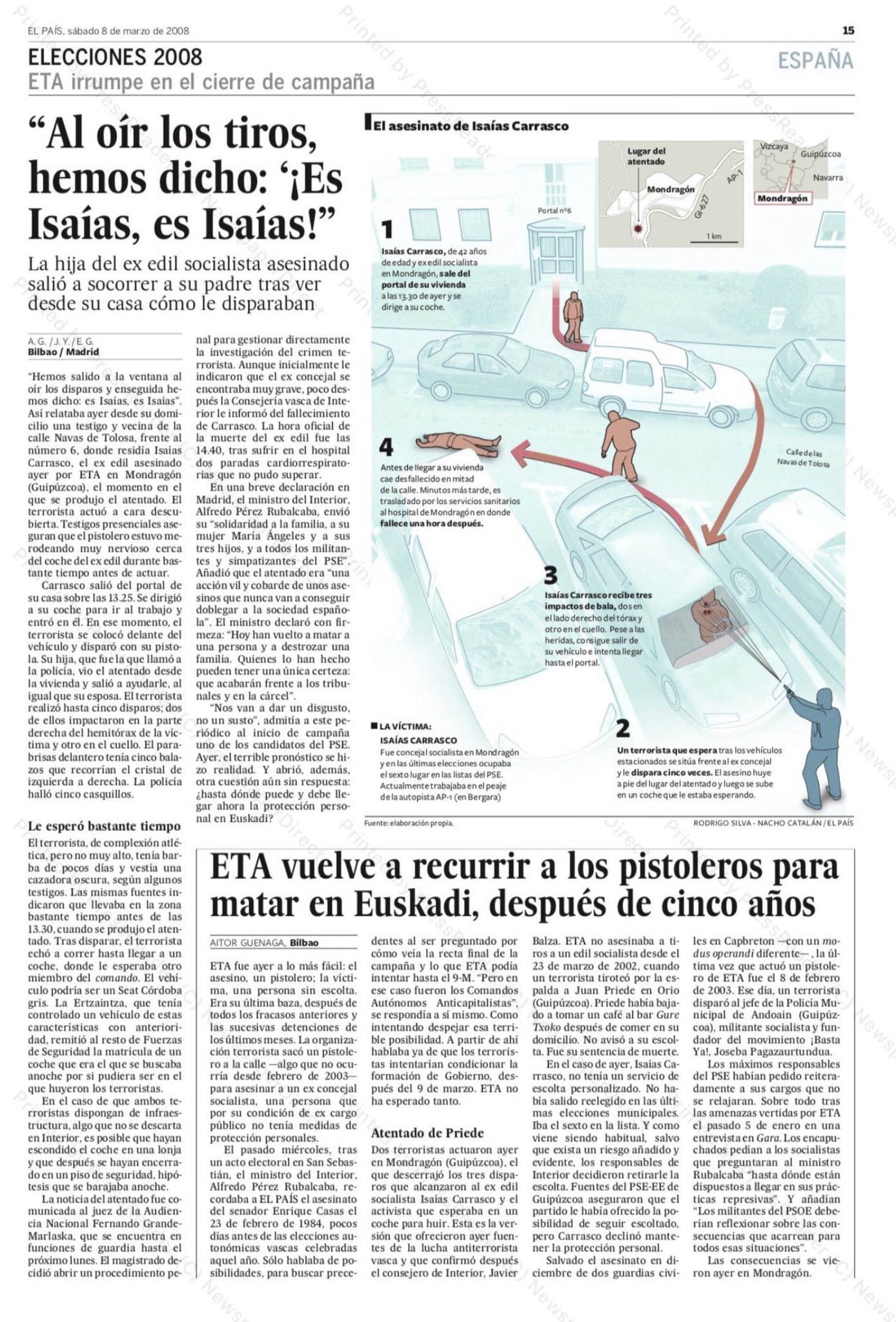 Dos días antes de las elecciones generales de 2008 es asesinado por un pistolero de la banda terrorista en Mondragón (Guipúzcoa) ISAÍAS CARRASCO MIGUEL, exconcejal socialista. Era la primera víctima mortal de las cuatro de ese año.