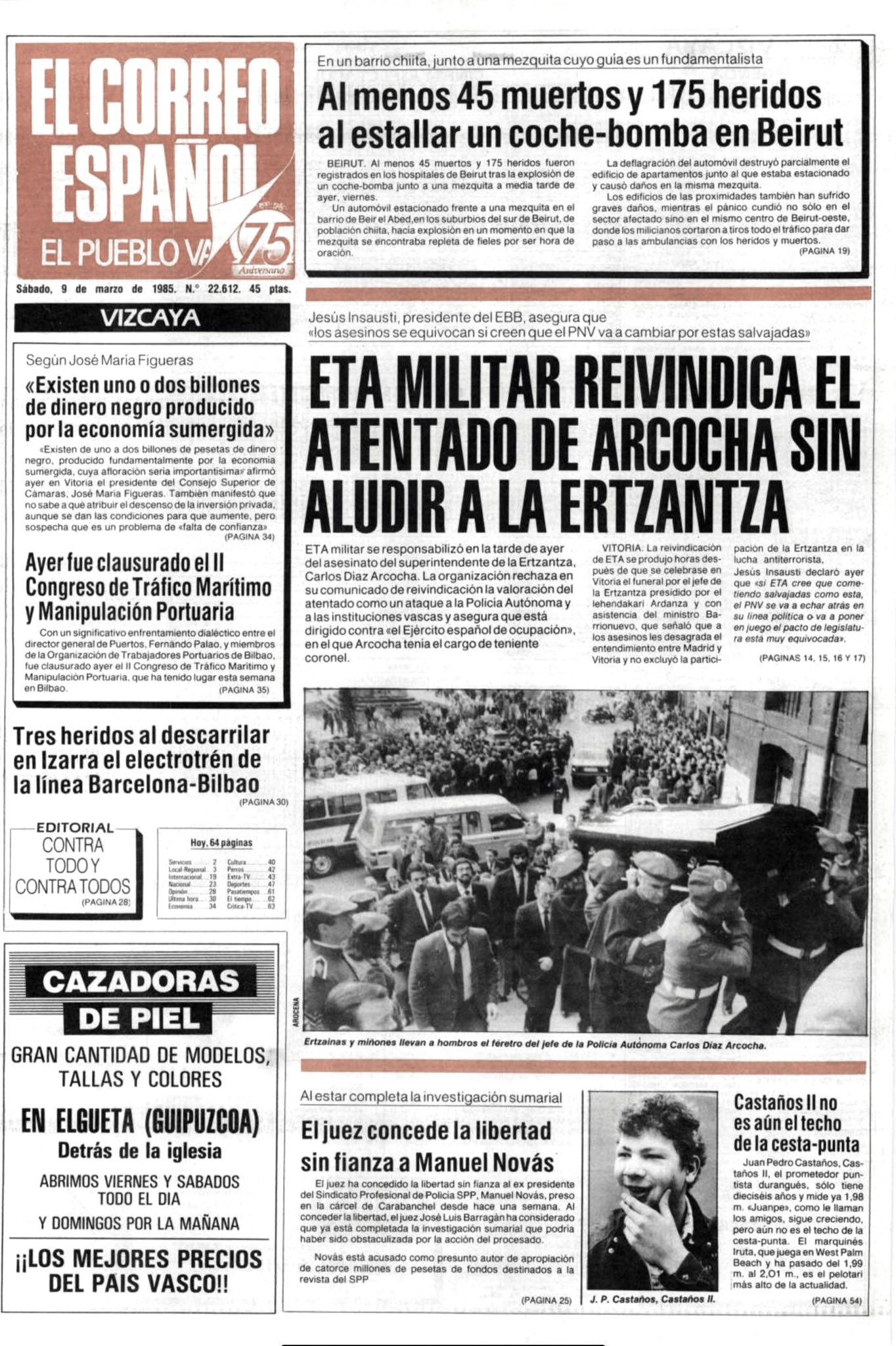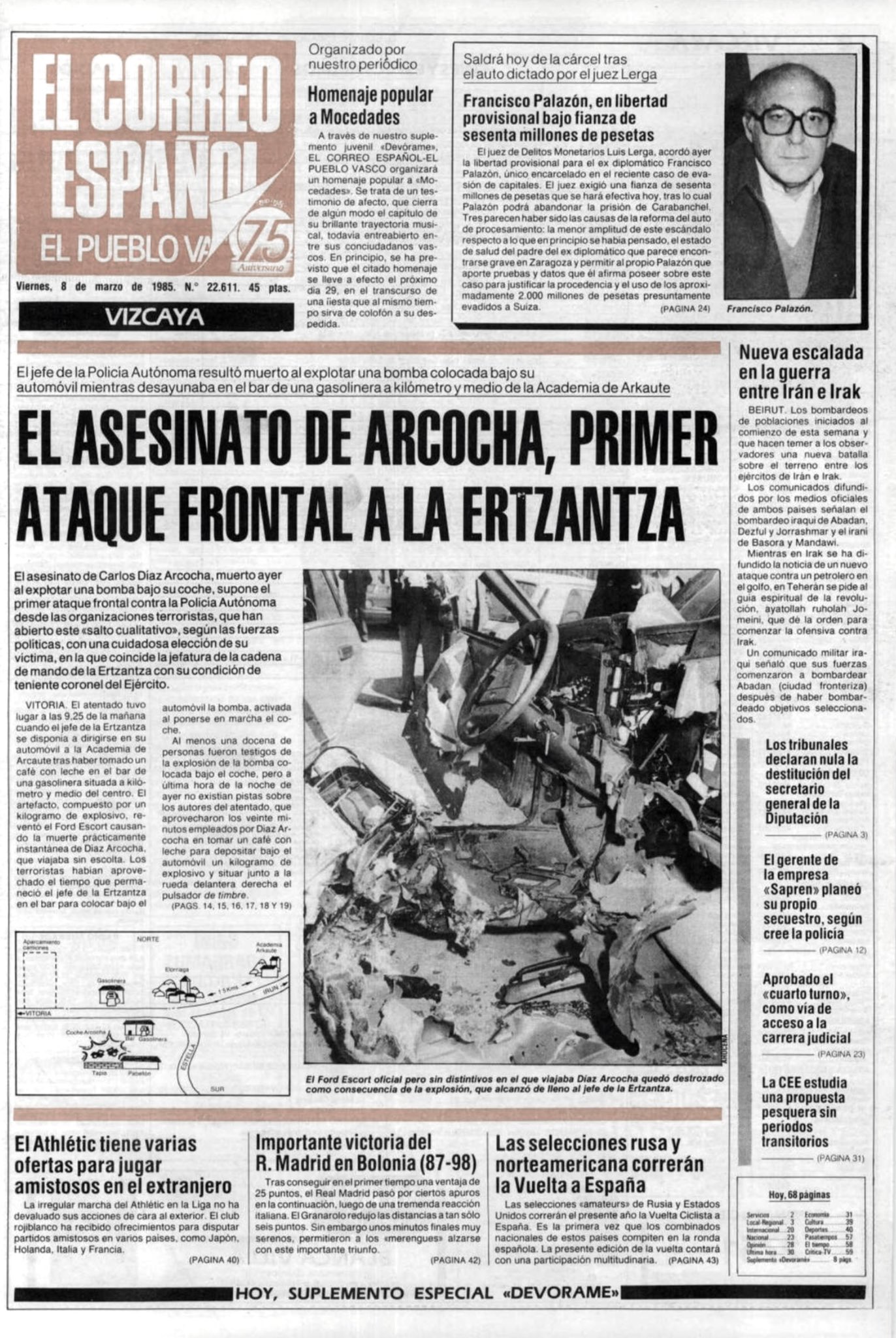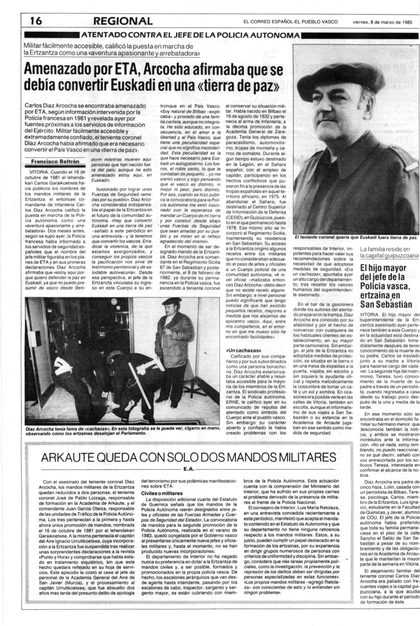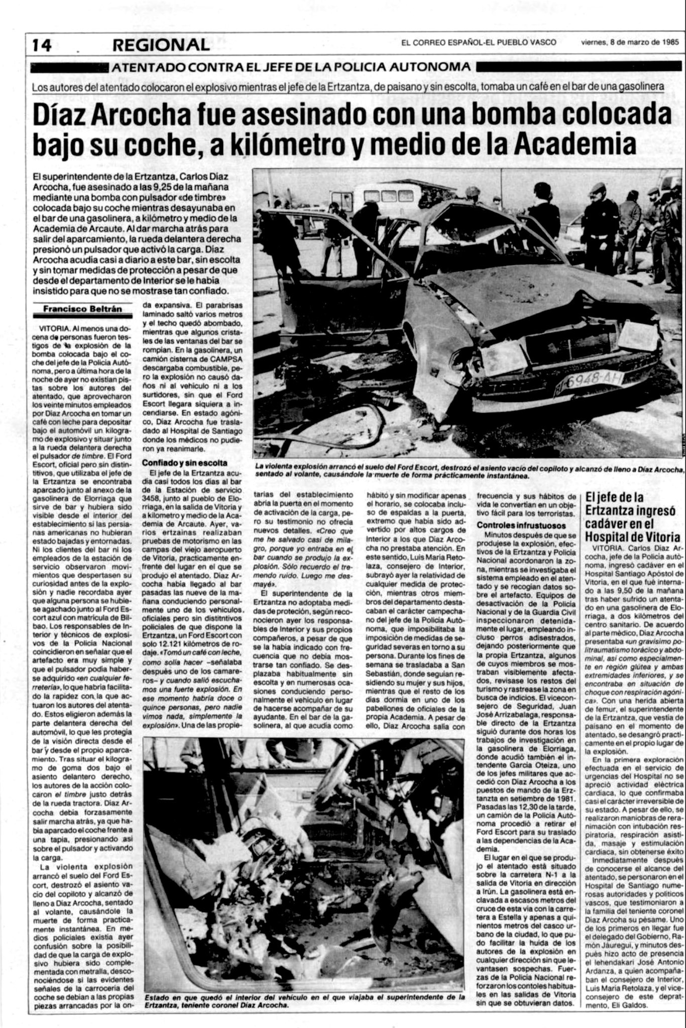 Poco después de las 9:30 horas del 7 de marzo de 1985, la banda terrorista ETA asesinaba al jefe máximo de la Policía Autónoma vasca, CARLOS DÍAZ ARCOCHA, al estallar una bomba colocada bajo su coche. Se acababa de subir al vehículo, después de desayunar en una cafetería próxima a Vitoria (Álava), e iba a dirigirse a la academia que la Ertzaintza tiene en Arcaute, en las afueras de la capital alavesa.