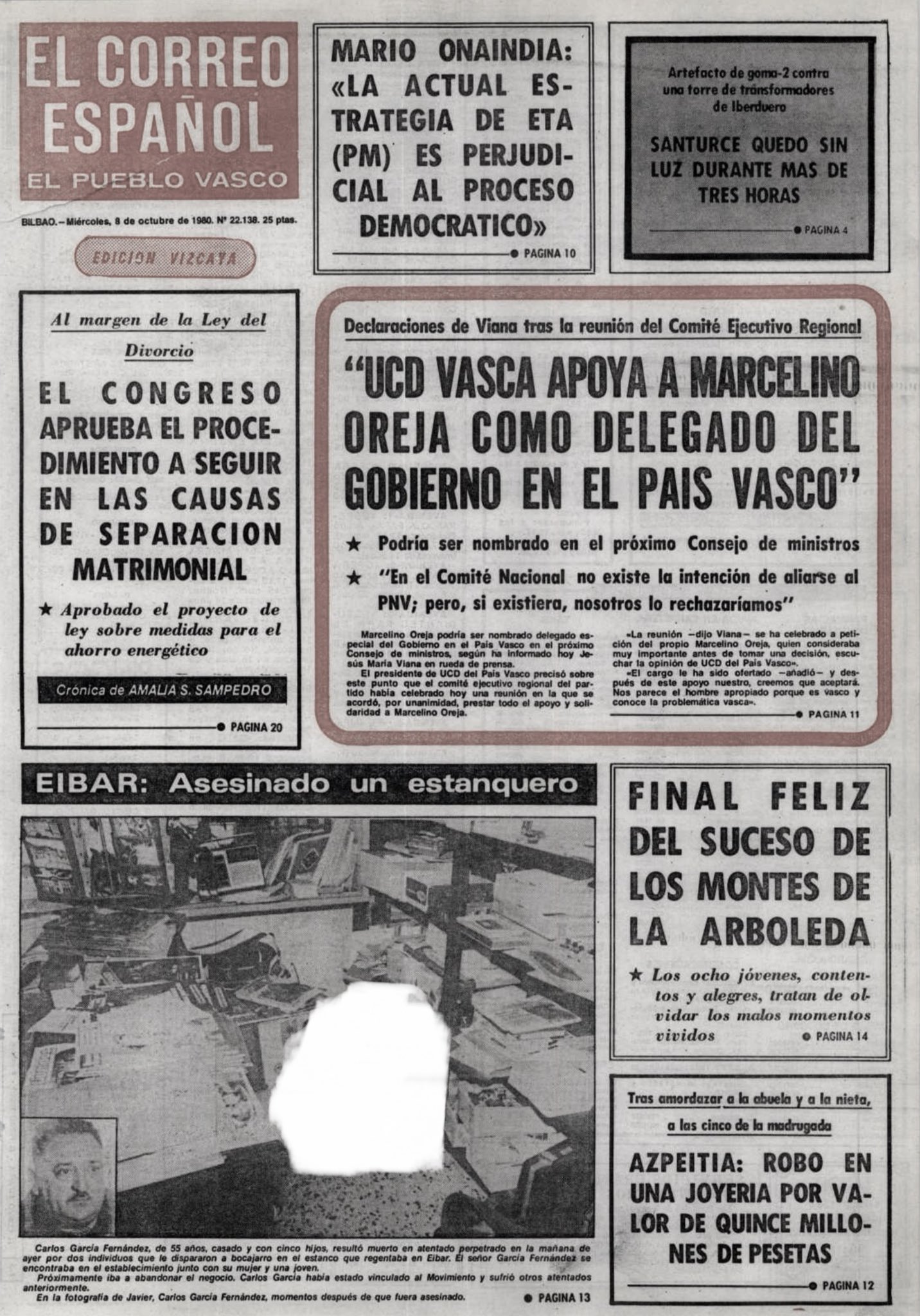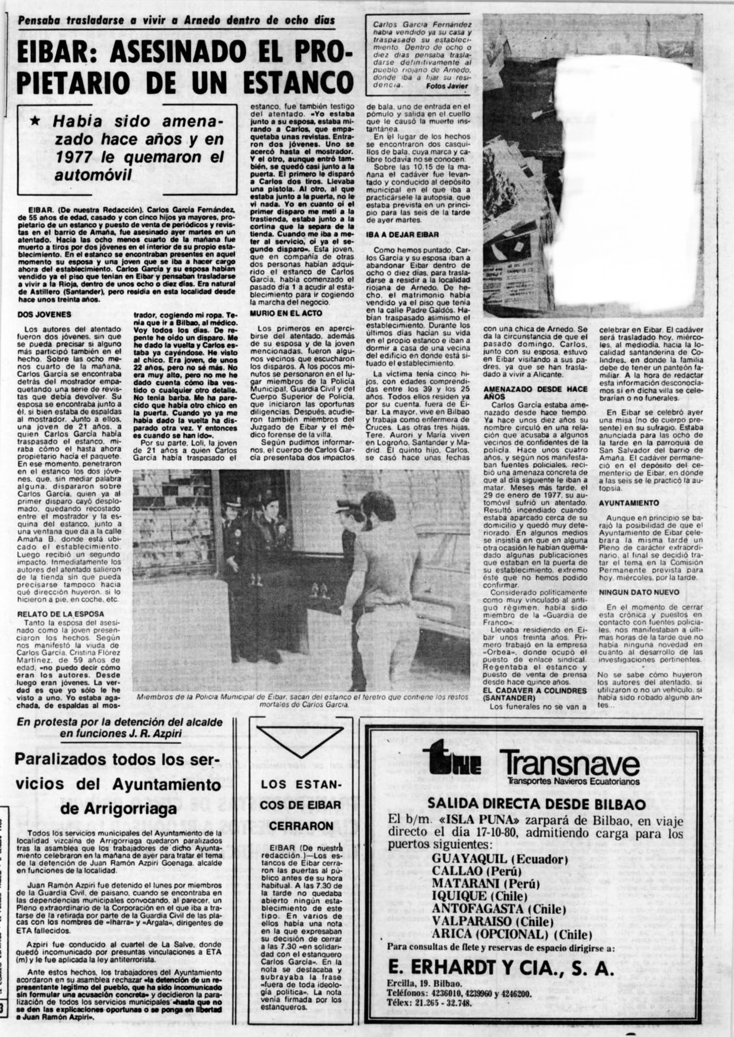 El martes 7 de octubre de 1980 la banda terrorista ETA asesinaba a tiros en la localidad guipuzcoana de Éibar al estanquero CARLOS GARCÍA FERNÁNDEZ. La víctima había recibido muchas amenazas de la banda asesina, y algunas de ellas se habían materializado, pues hasta en dos ocasiones le quemaron su coche y en julio de 1977 le prendieron fuego al estanco causándole cuantiosas pérdidas.