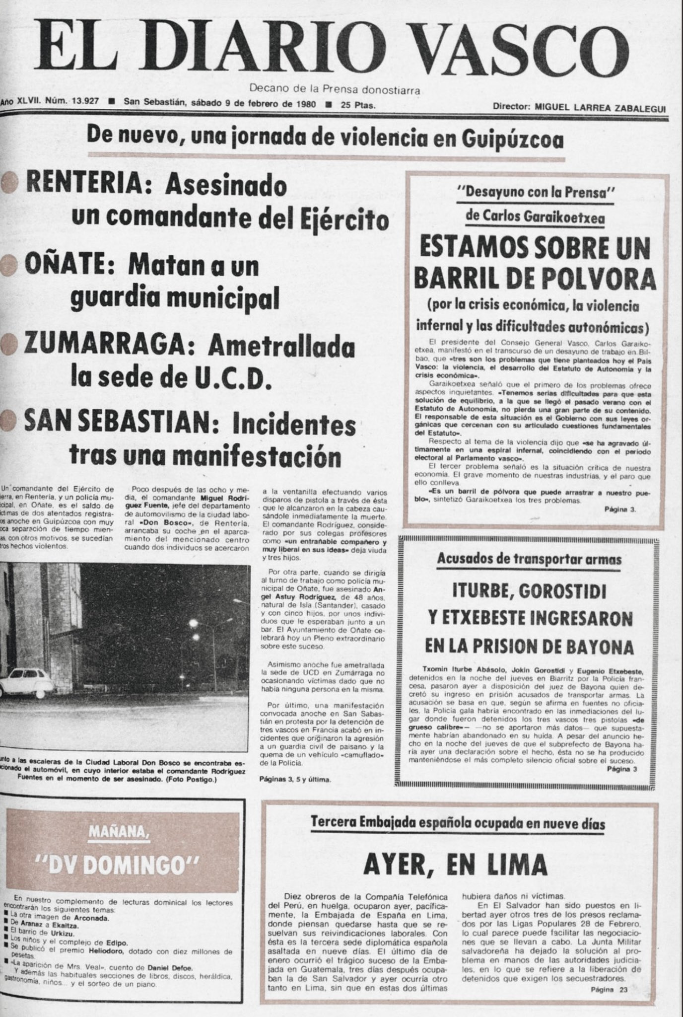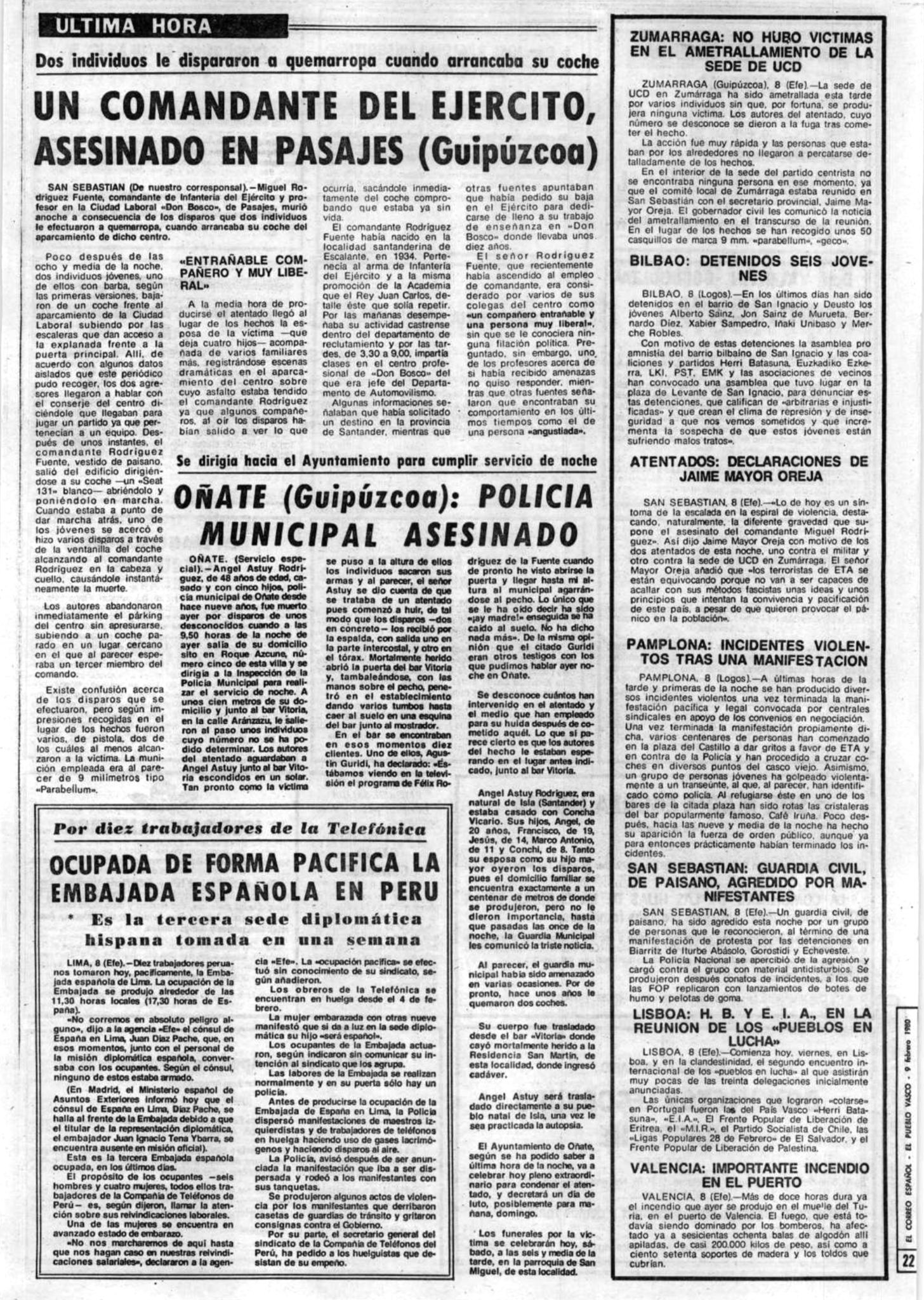 Una hora después, a sólo 85 kilómetros, ese mismo 8 de febrero de 1980 era asesinado en Oñate (Guipúzcoa) el policía municipal ÁNGEL ASTUY RODRÍGUEZ. Era primo del comandante Rodríguez Fuentes. Ángel se dirigía a su trabajo para entrar en el turno de noche. Mientras caminaba por la calle de Aránzazu, fue tiroteado por dos terroristas que circulaban en un vehículo en el que se dieron inmediatamente a la fuga. Alcanzado por tres disparos, consiguió llegar hasta la puerta del Bar Vitoria para pedir ayuda, pero murió en la puerta del establecimiento.