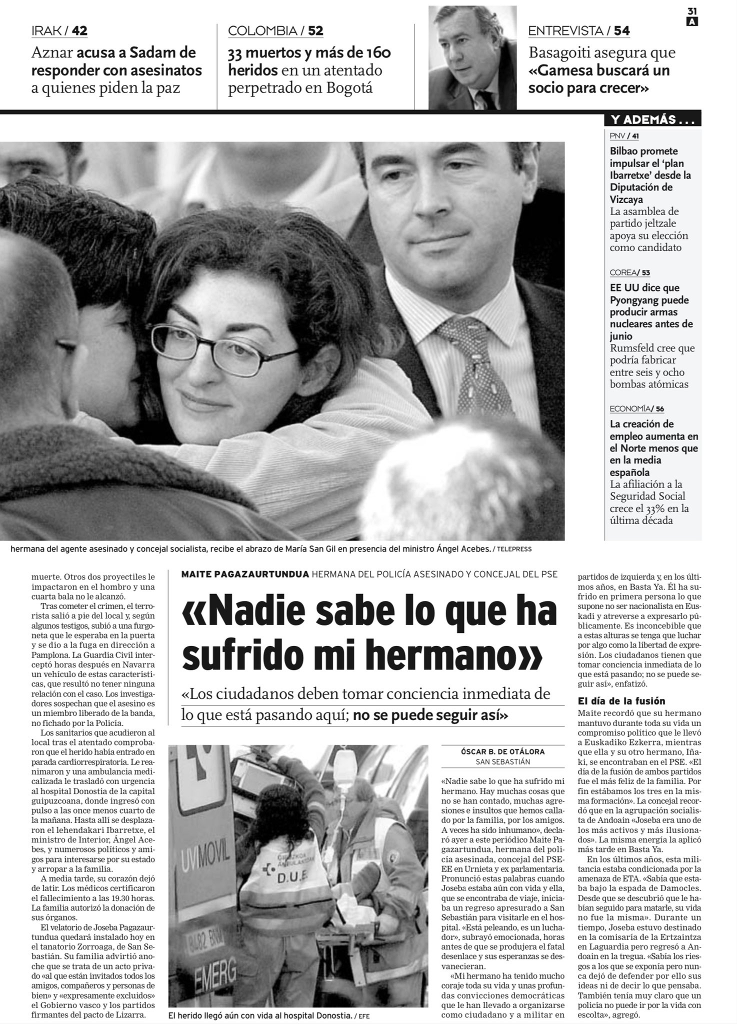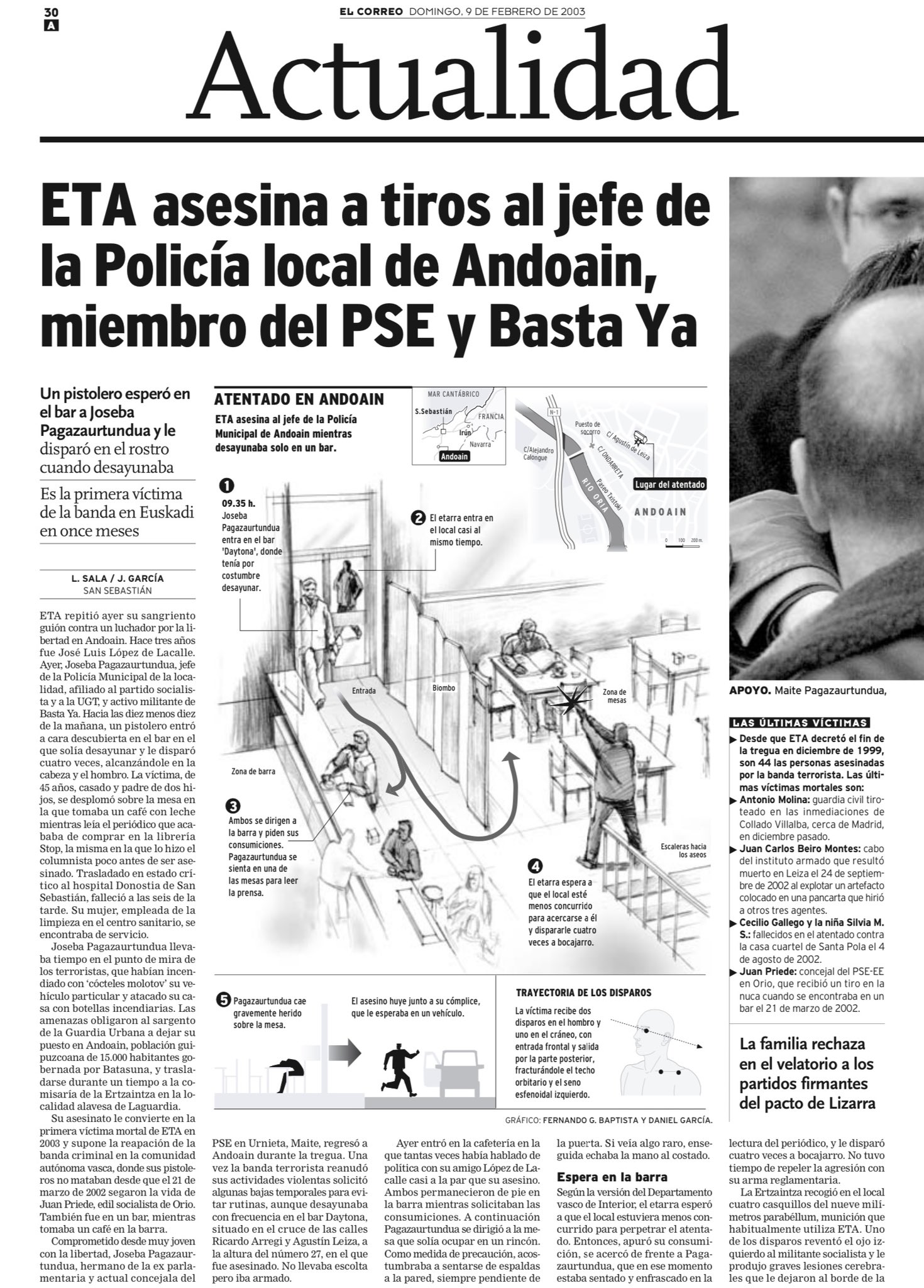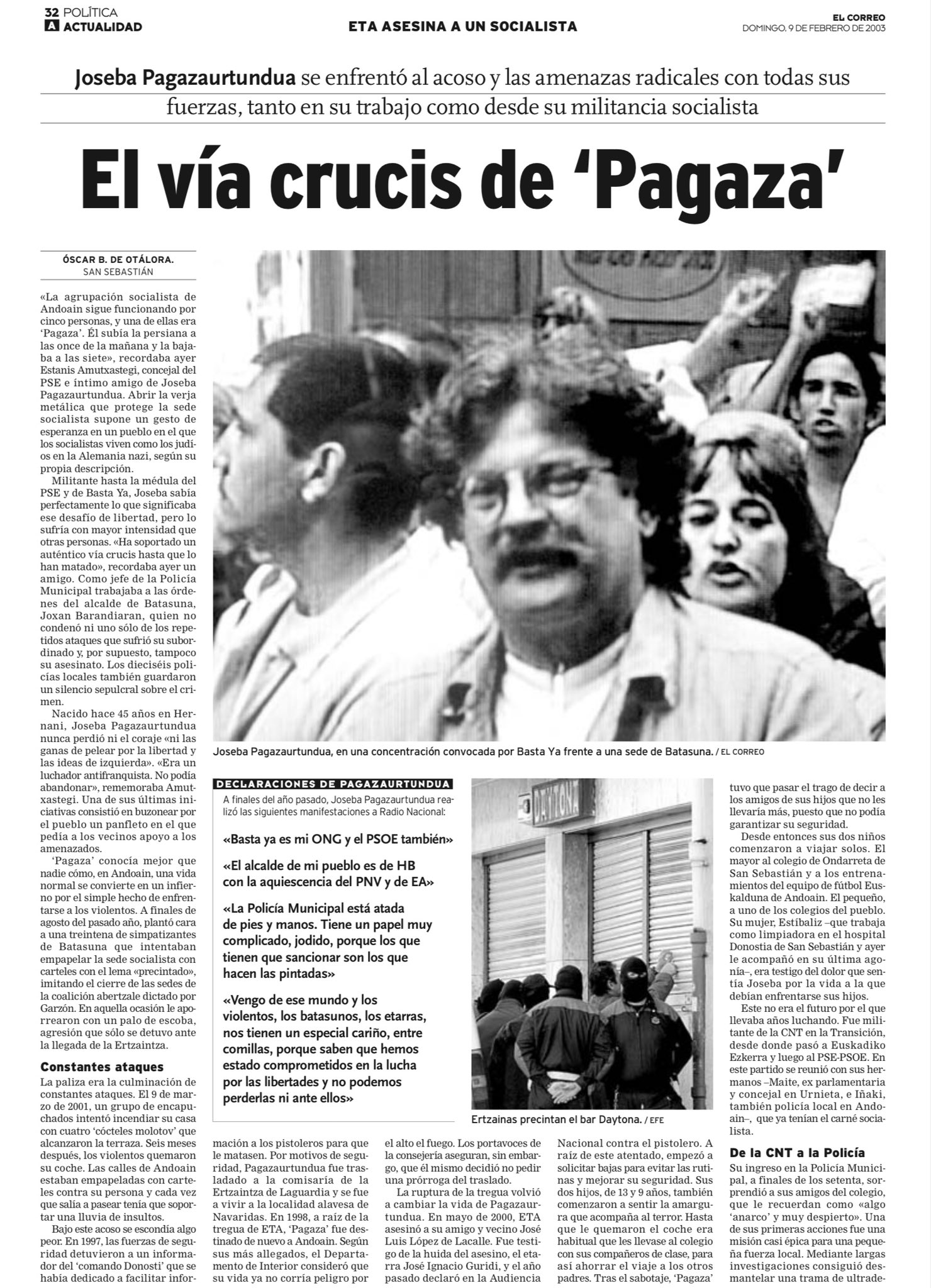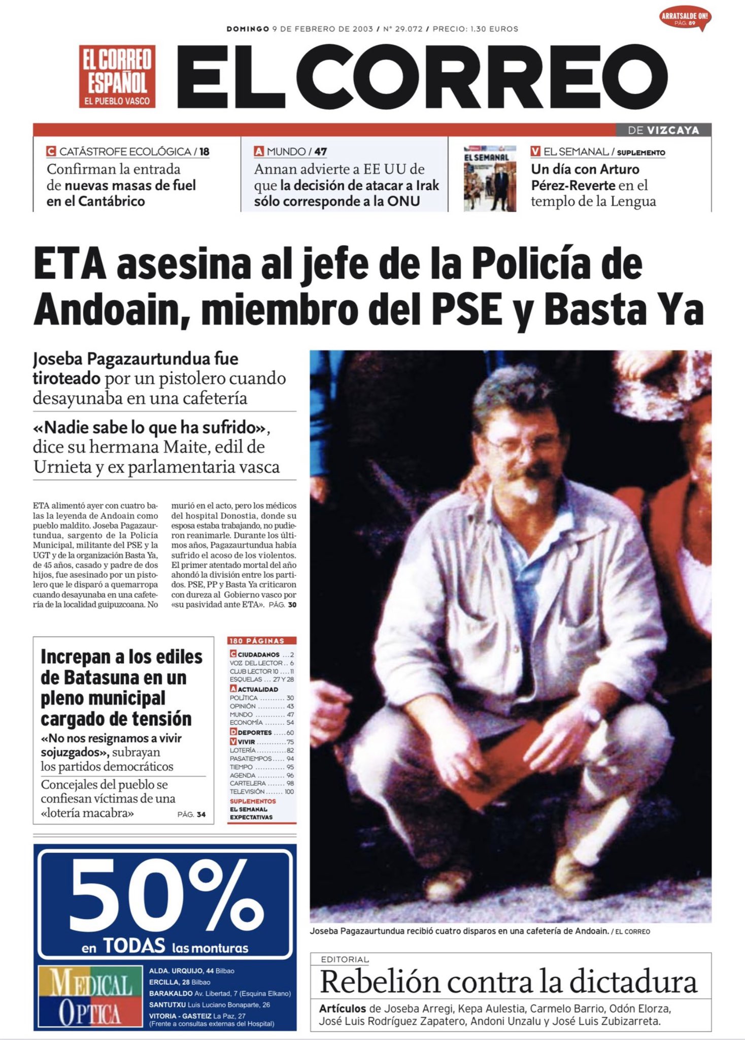 El 8 de febrero de 2003 es asesinado en Andoáin (Guipúzcoa) JOSEBA PAGAZAURTUNDÚA RUIZ. Poco antes de las 10:00 horas, mientras desayunaba, Joseba fue tiroteado en el Bar Daytona. Trasladado al Hospital Donostia, de San Sebastián, murió nueve horas después, en torno a las cinco de la tarde.