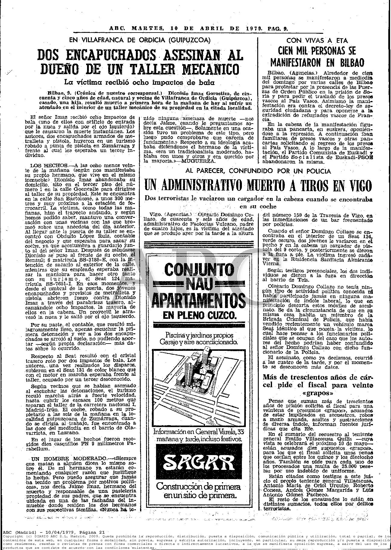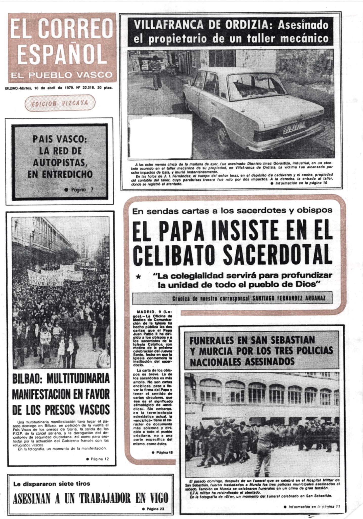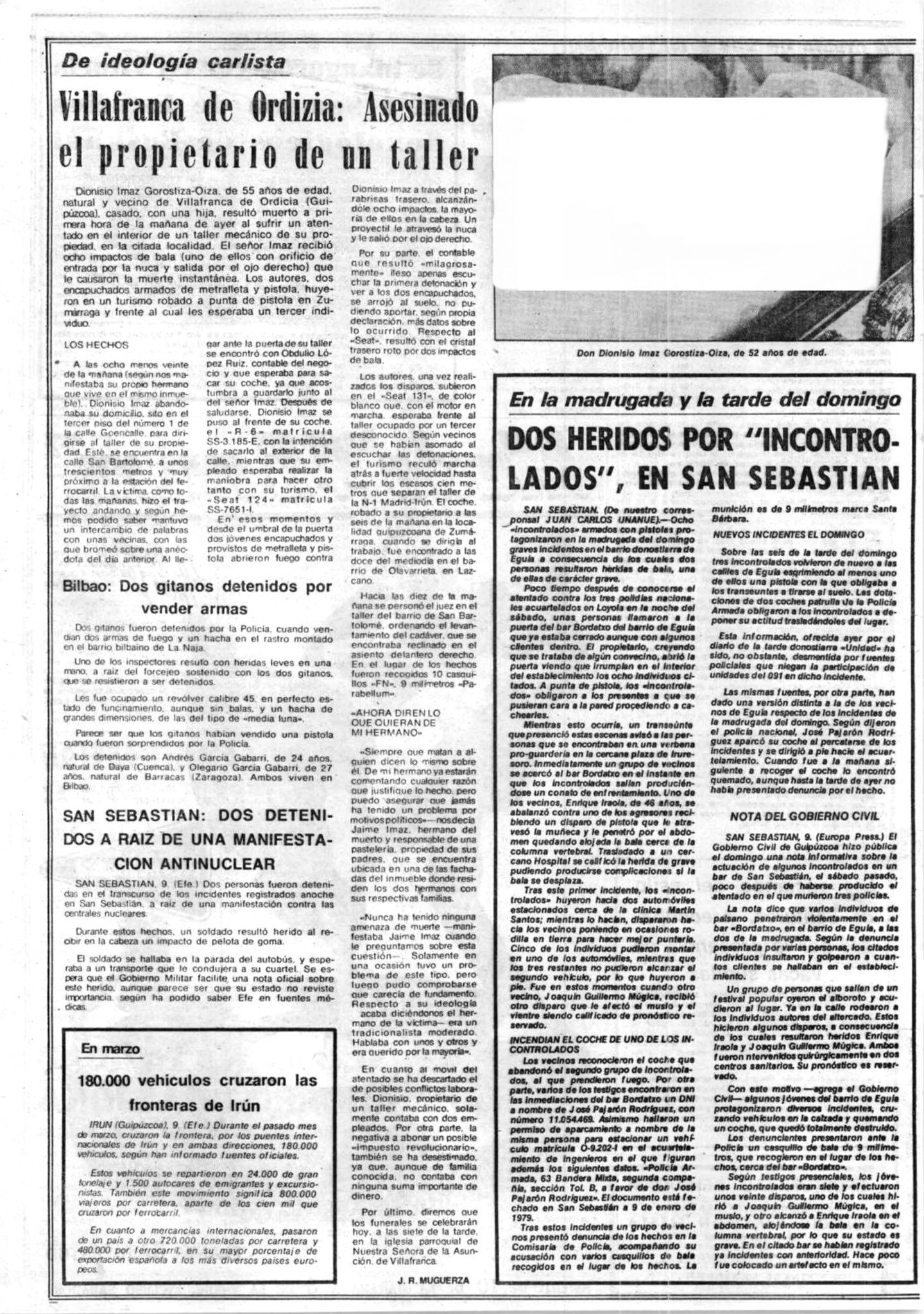 El 9 de abril de 1979 la banda terrorista asesina a DIONISIO IMAZ GOROSTIZA, dueño de un modesto taller mecánico en Villafranca de Ordicia (Guipúzcoa).Dionisio fue sorprendido por dos miembros de ETA en el momento en el que se disponía a retirar su automóvil del taller mecánico, con el objeto de dejar paso a otro coche propiedad del contable del taller, Obdulio López Ruiz.