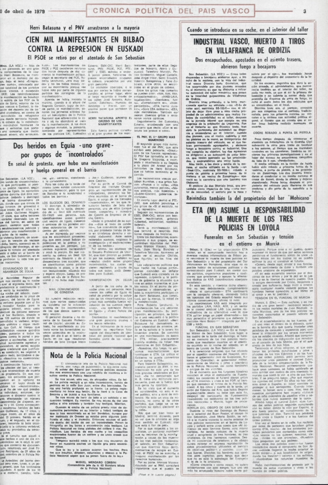 ETA asesinaba de nuevo a un miembro de la Policía Nacional, FRANCISCO FRANCÉS GARZÓN.Eran las siete de la mañana del 9 de abril de 1981, cuando cinco terroristas tendieron una emboscada a los miembros de dos dotaciones de coches patrulla que habían acudido a instalar un control en las carreteras de acceso al centro de Bilbao. Apenas descendieron de los vehículos para colocar las señales indicativas correspondientes, fueron tiroteados desde una distancia de unos sesenta metros con fusiles Cetme, metralletas y escopetas de postas.