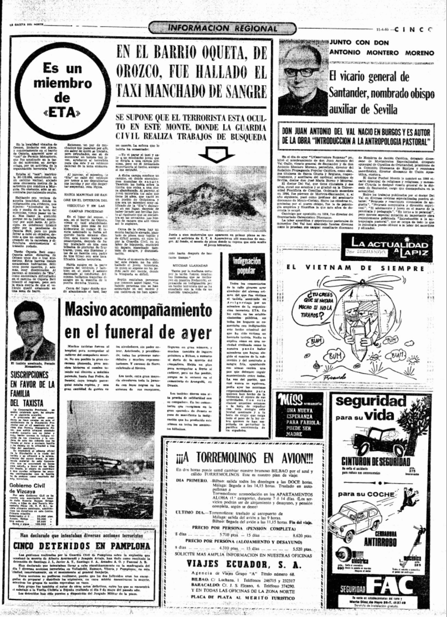 En el piso se encontraban algunos de los etarras que, posteriormente, serían juzgados en el Consejo de Guerra de Burgos, como Mario Onaindía, Txutxo Abrisqueta o Víctor Arana Bilbao. Estos tres fueron arrestados nada más irrumpir la Policía en el piso, pero Miguel Etxebarría Iztueta, alias Makagüen, consiguió alcanzar la calle, pese a resultar herido por dos disparos.Allí paró un taxi, conducido por FERMÍN MONASTERIO PÉREZ, al que pidió que le sacara del País Vasco y le llevase a Burgos. Fermín se percató de que estaba herido y se negó a seguir si el etarra no le explicaba el origen de las heridas. La reacción de Etxebarría fue meterle cuatro disparos a bocajarro cuando se encontraban a la altura de Arrigorriaga. A continuación, sacó a Fermín del taxi y lo arrojó malherido al suelo, se puso al volante y huyó conduciendo el vehículo.