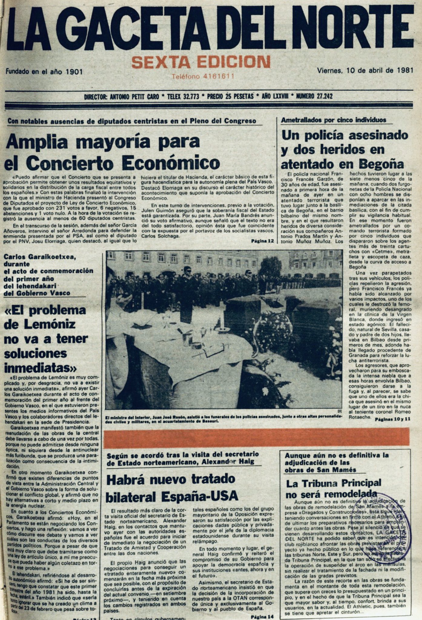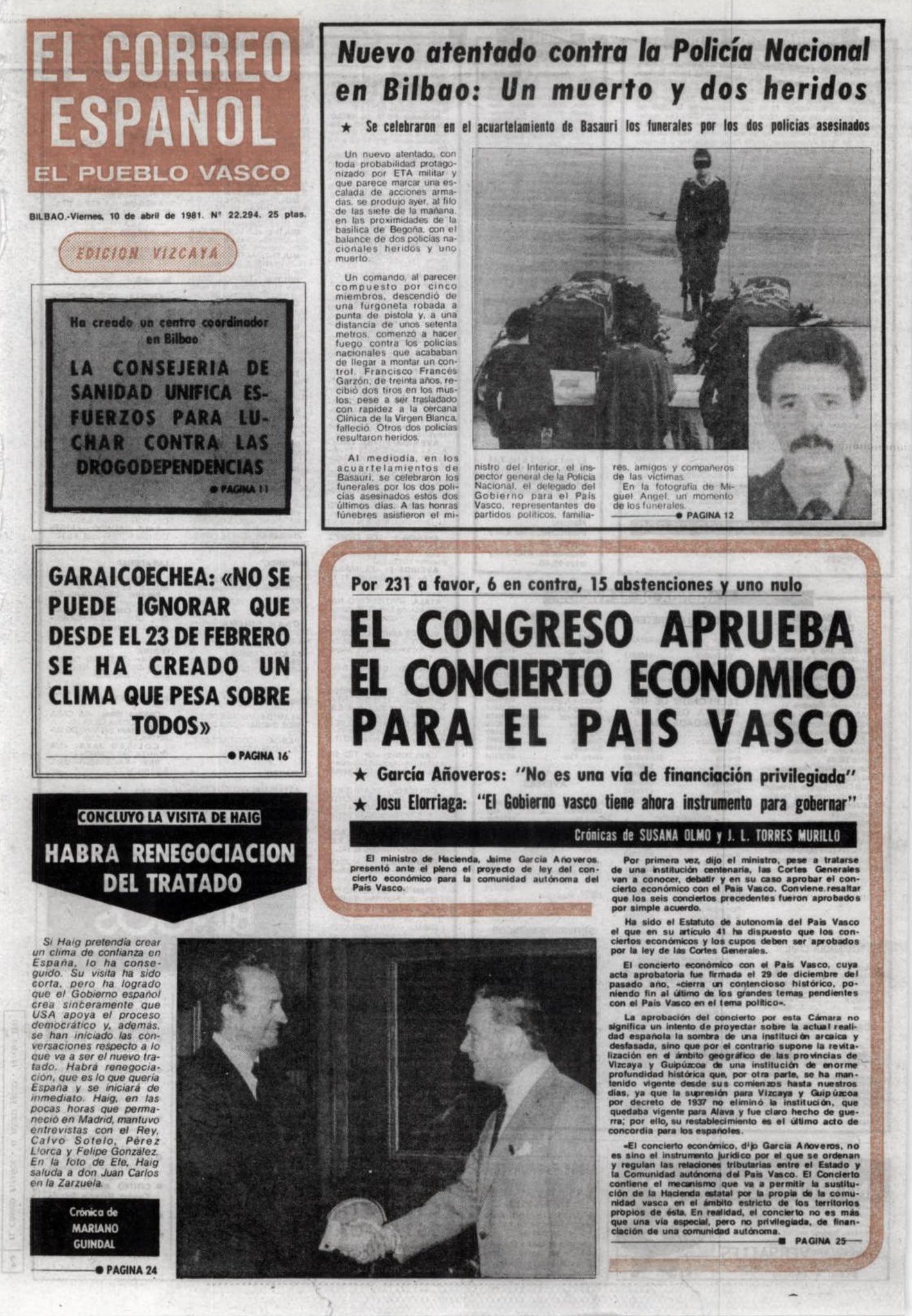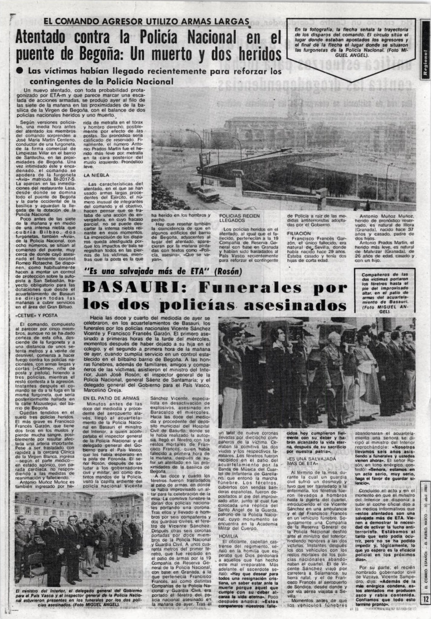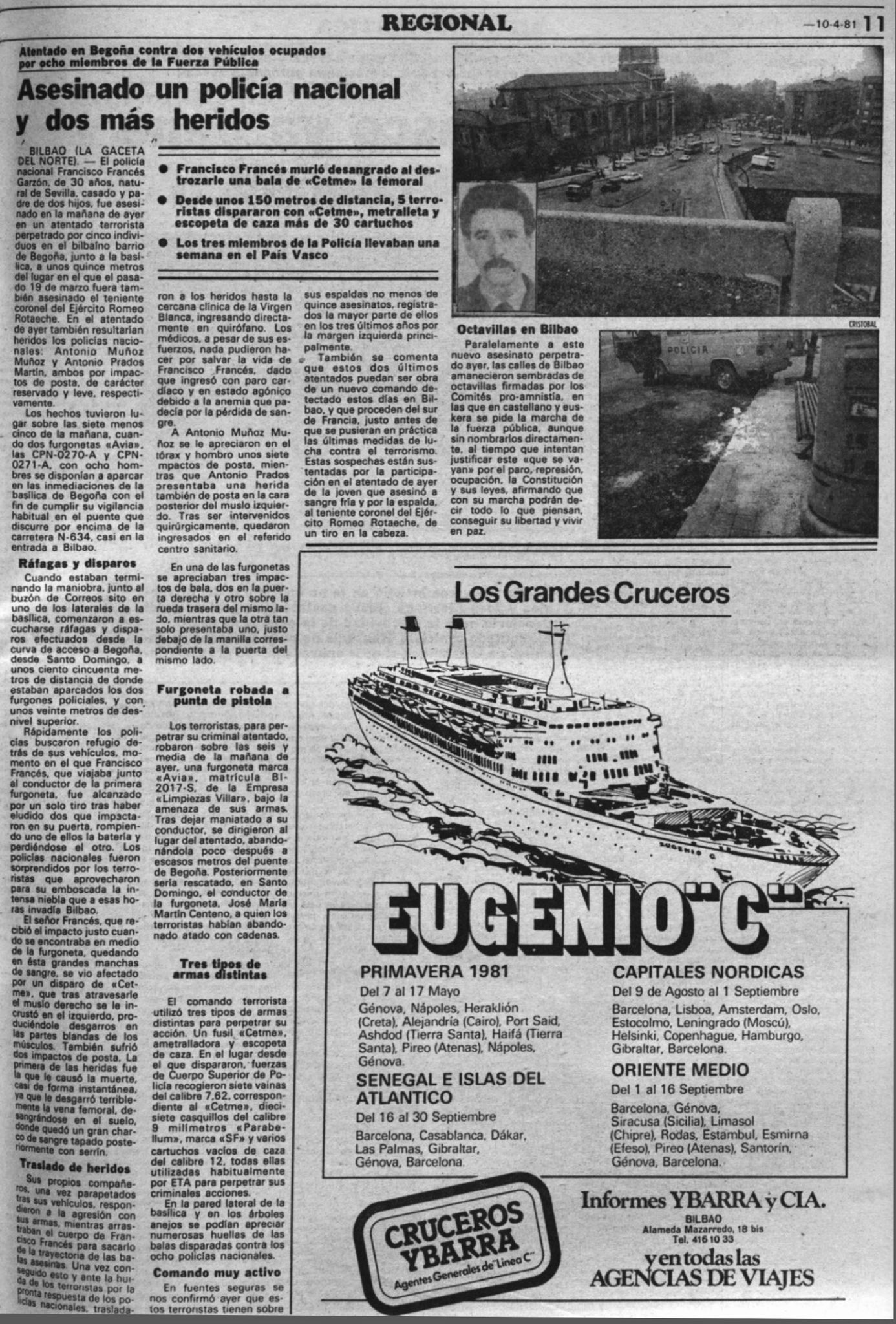 ETA asesinaba de nuevo a un miembro de la Policía Nacional, FRANCISCO FRANCÉS GARZÓN.Eran las siete de la mañana del 9 de abril de 1981, cuando cinco terroristas tendieron una emboscada a los miembros de dos dotaciones de coches patrulla que habían acudido a instalar un control en las carreteras de acceso al centro de Bilbao. Apenas descendieron de los vehículos para colocar las señales indicativas correspondientes, fueron tiroteados desde una distancia de unos sesenta metros con fusiles Cetme, metralletas y escopetas de postas.