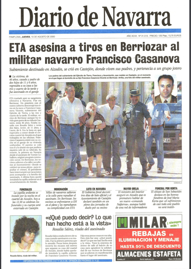 El 9 de Agosto de 2001 la banda terrorista ETA asesinaba en Berriozar (Navarra) al subteniente de Infantería del Ejército de Tierra FRANCISCO CASANOVA VICENTE. La víctima recibió varios tiros en la nuca a las tres y cuarto de la tarde del miércoles mientras aparcaba su coche en el garaje de su domicilio ubicado en una zona residencial de la localidad navarra. El asesino se introdujo en el garaje tras el automóvil del militar, mientras un segundo terrorista esperaba en la puerta, y le disparó varias veces.