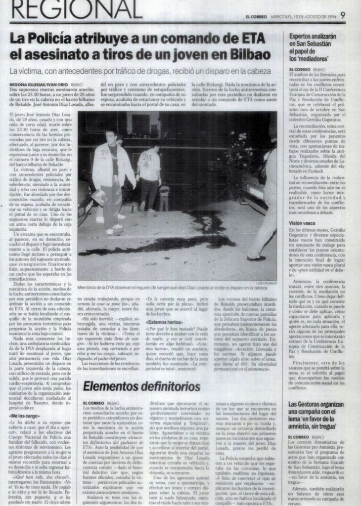 A última hora de la noche del martes 9 de agosto de 1994, la banda terrorista ETA asesinaba frente a su domicilio en Bilbao al albañil JOSÉ ANTONIO DÍAZ LOSADA. Hacia las 23:30 horas, el joven regresaba a su casa junto a su mujer y su hija de catorce meses en una furgoneta de su propiedad. José Antonio dejó a su familia frente al portal, mientras él se fue a aparcar el vehículo. Cuando se dirigía de nuevo hacia el portal de su domicilio dos individuos se le acercaron por la espalda y, sin previo aviso, uno de ellos le disparó en la cabeza, mientras el segundo cubría la acción. El proyectil penetró por el pómulo izquierdo y quedó alojado en la cabeza de la víctima.