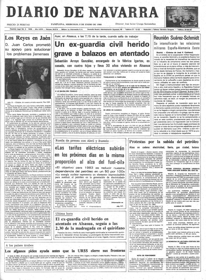 El 9 de enero de 1980 fallece SEBASTIÁN ARROYO GONZÁLEZ, que el día anterior fue ametrallado cuando se dirigía en su vehículo a su domicilio desde la empresa en la que trabajaba en Alsasua.