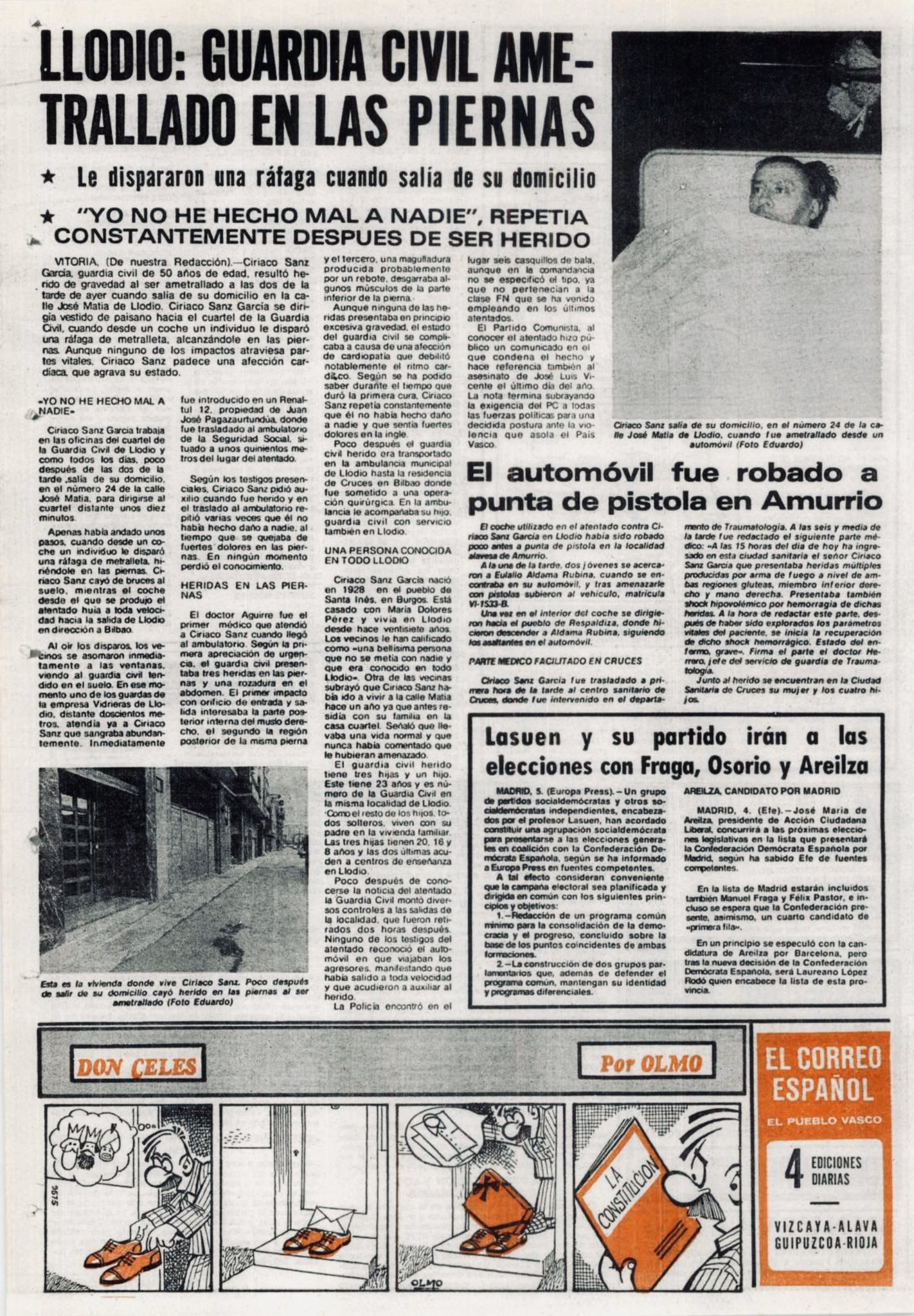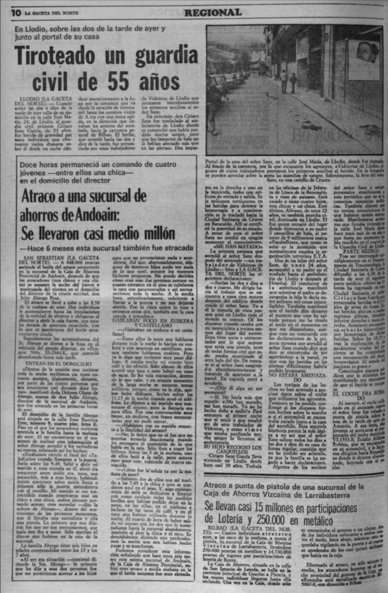 En la tarde del 9 de enero de 1979 fallece el guardia civil CIRIACO SANZ GARCÍA, como consecuencia del atentado sufrido cuatro días antes, el 5 de enero. Sanz García recibió varias ráfagas de ametralladora que le dispararon desde un vehículo Seat cuando salía de su domicilio en torno a las dos de la tarde.