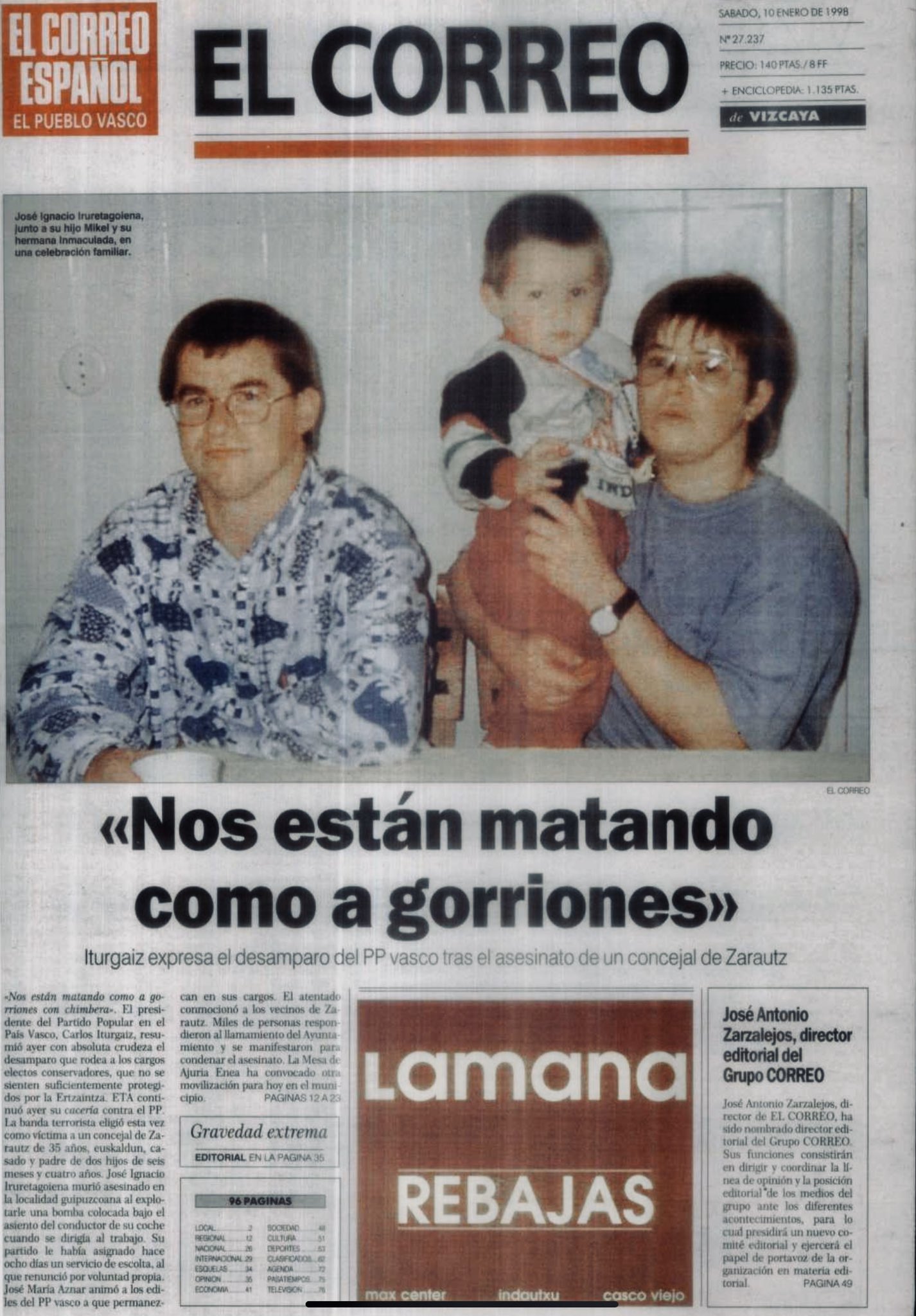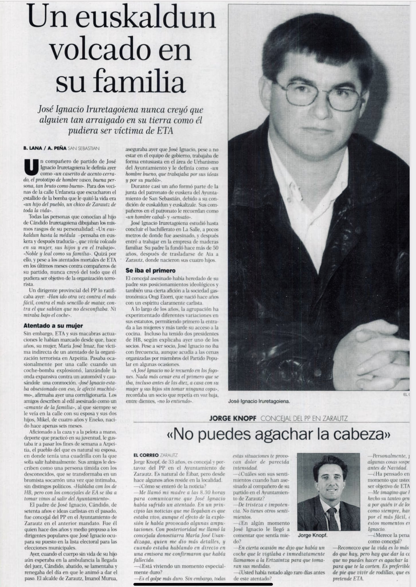 Dieciocho años después, el 9 de enero de 1998, era asesinado en Zarauz (Guipúzcoa) el concejal JOSÉ IGNACIO IRURETAGOYENA, cuarto edil del PP vasco que moría víctima de ETA desde que Gregorio Ordóñez, con el que había mantenido una estrecha relación, recibió un tiro en la cabeza en 1995. Además de ser uno de los dos concejales que el PP consiguió en Zarauz en mayo de 1995, José Ignacio era maderero de profesión.