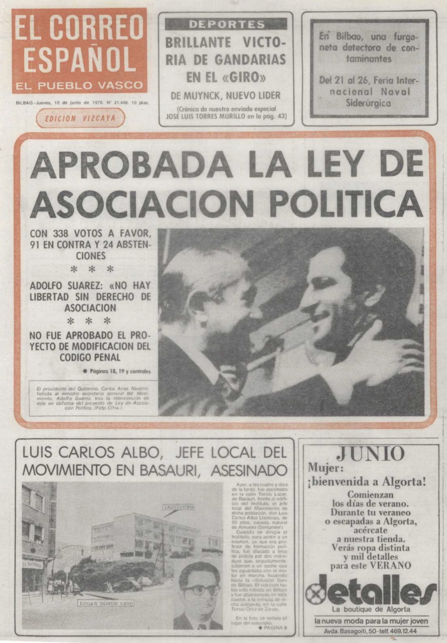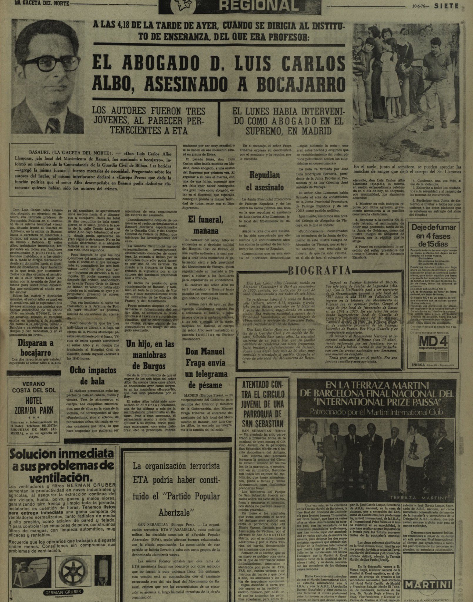 A las cuatro de la tarde del miércoles 9 de junio de 1976 la banda terrorista ETA asesinaba a tiros en Basauri a LUIS CARLOS ALBO LLAMOSAS cuando se dirigía a pie al Instituto de Enseñanza Media de la localidad vizcaína, donde daba clases de Formación Política.Dos terroristas le esperaban en el cruce de la calle Tercio de Lácar con la avenida de José Antonio. Cuando la víctima se acercó efectuaron varios disparos de pistola a bocajarro y, seguidamente, se dieron a la fuga en dirección a Bilbao en un coche donde les esperaba una tercera persona con el motor en marcha.