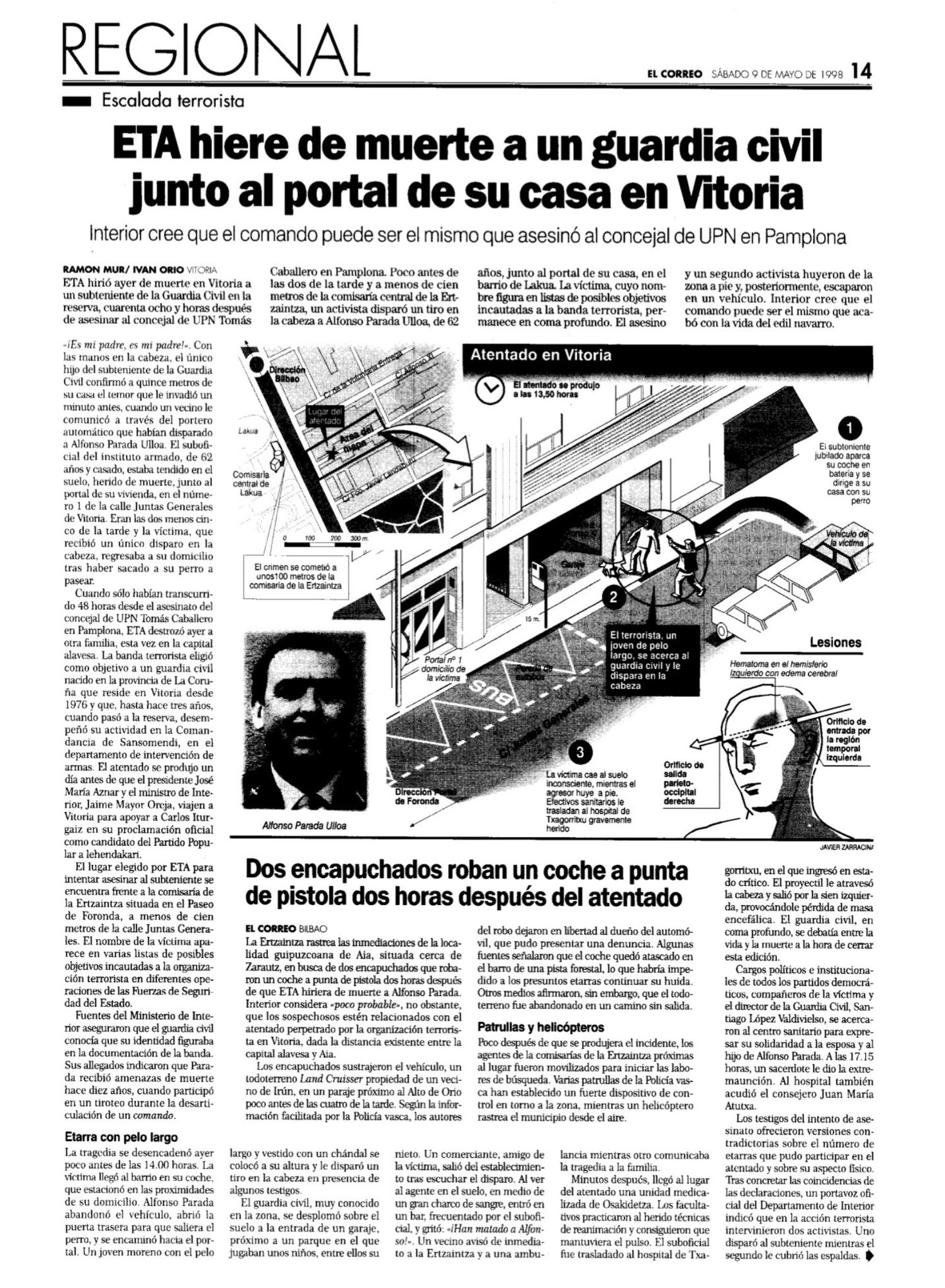 El 8 de mayo de 1998, un etarra disparaba en la cabeza al subteniente retirado de la guardia civil, ALFONSO PARADA ULLOA. Trasladado por una UVI móvil al Hospital Txagorritxu murió la madrugada del día siguiente, 9 de mayo. El disparo entró por su sien izquierda y salió por la derecha y, aunque en un primer momento los equipos de urgencias del hospital vitoriano barajaron la posibilidad de una intervención quirúrgica, finalmente la descartaron dada la gravedad de la herida. Alfonso Parada fue tiroteado a escasos metros de su domicilio por un individuo joven que le disparó a la cabeza a corta distancia. Eran aproximadamente las dos de la tarde. El atentado se produjo en la calle de las Juntas Generales, donde vivía la familia Parada Ulloa, y a menos de cien metros de la comisaría de la Ertzaintza.