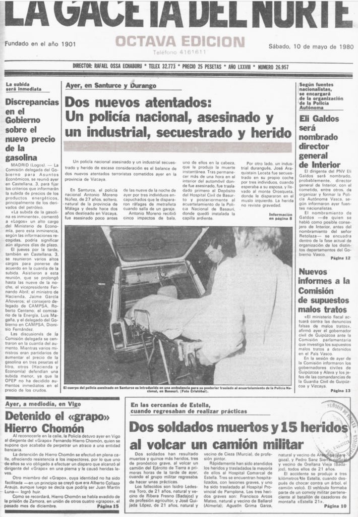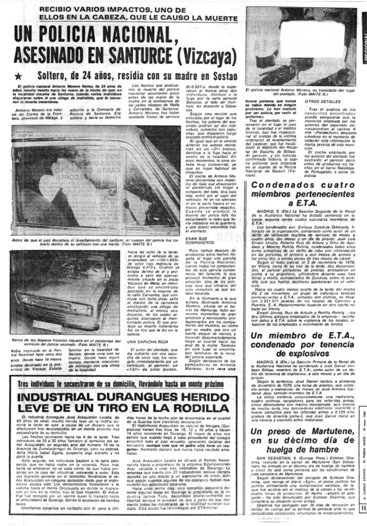 A las nueve de la noche del 9 de mayo de 1980 ETA asesinaba en Santurce (Vizcaya) al policía nacional ANTONIO MORENO NÚÑEZ. Antonio se dirigía a su domicilio en Bilbao tras terminar su jornada laborar en la comisaría de Santurce. Circulaba por la calle Cervantes y, al llegar a la altura de la plaza de Vázquez de Mella y detener el vehículo, tres encapuchados que viajaban en otro coche lo acribillaron a balazos.Antonio fue alcanzado por cinco impactos, uno de ellos en la cabeza. Su coche presentaba varios impactos de bala.