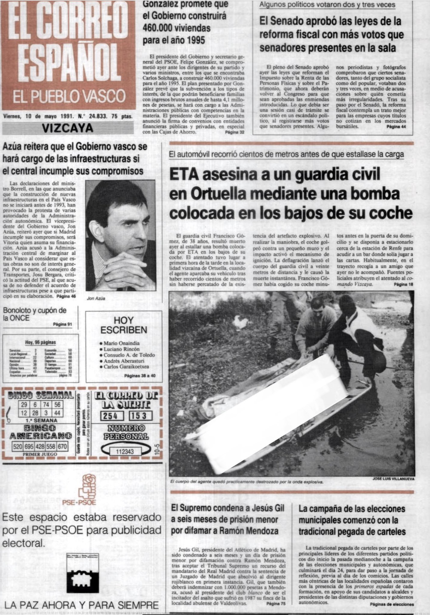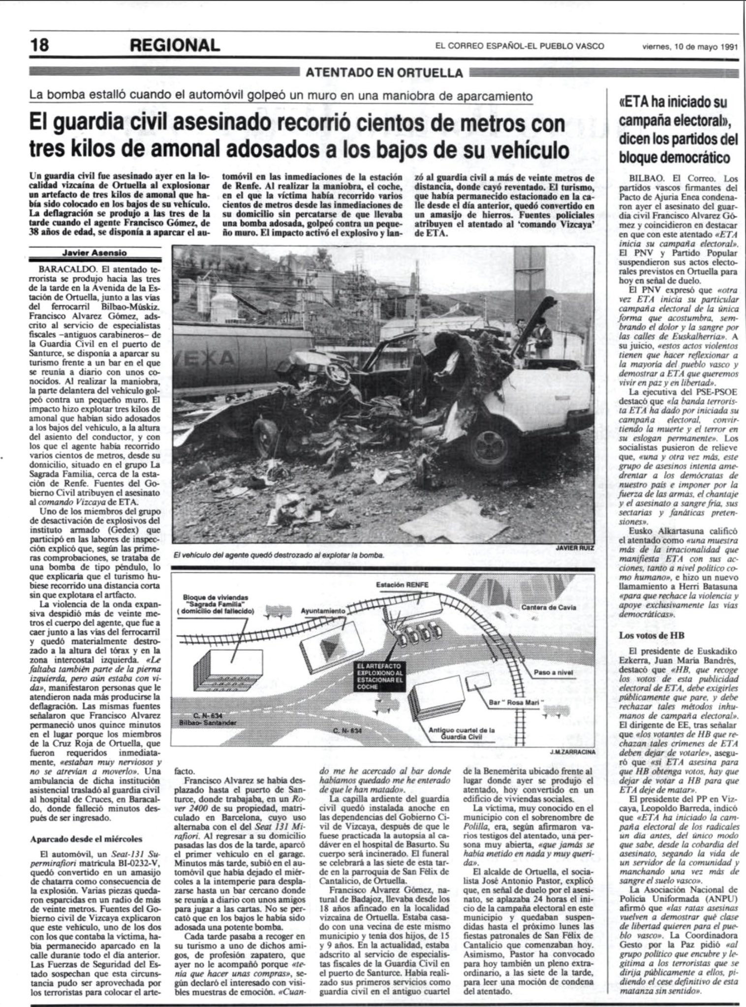 El 9 de mayo de 1991, nueve horas antes de que diera comienzo la campaña electoral de las elecciones autonómicas y municipales del 27 de mayo, ETA asesinaba en Ortuella (Vizcaya) al guardia civil FRANCISCO ÁLVAREZ GÓMEZ mediante la colocación de una bomba-lapa en los bajos de su vehículo.