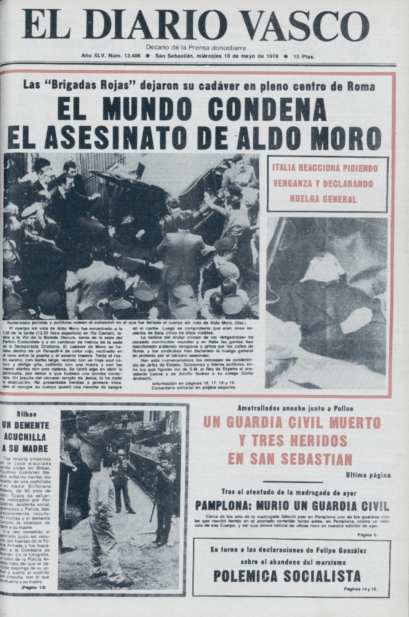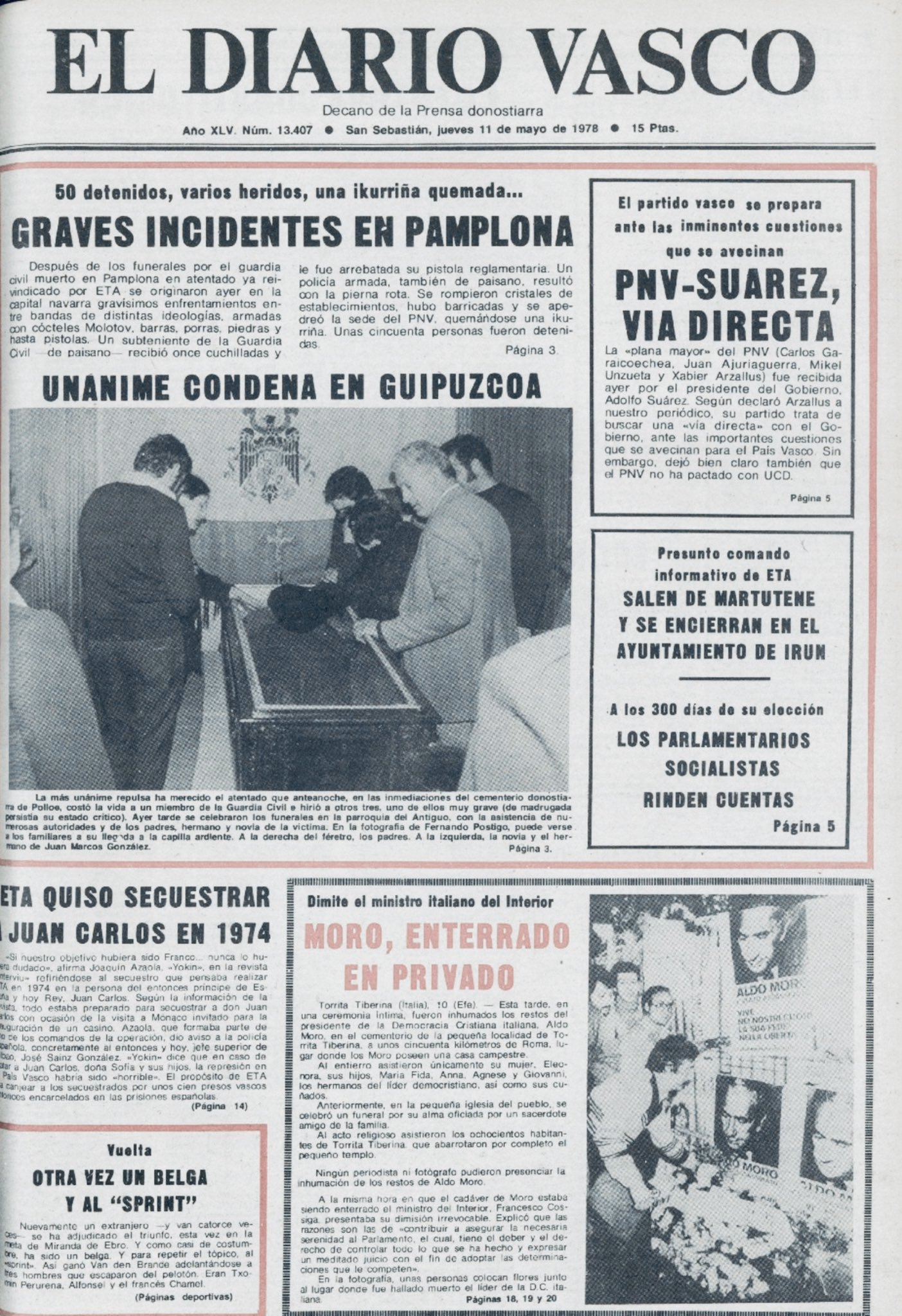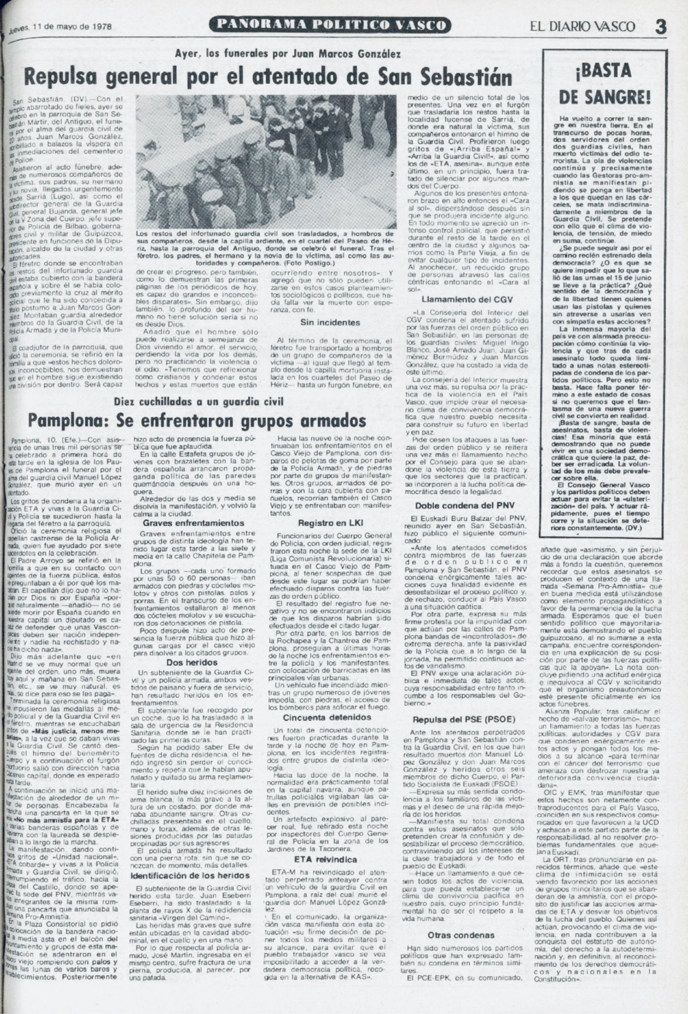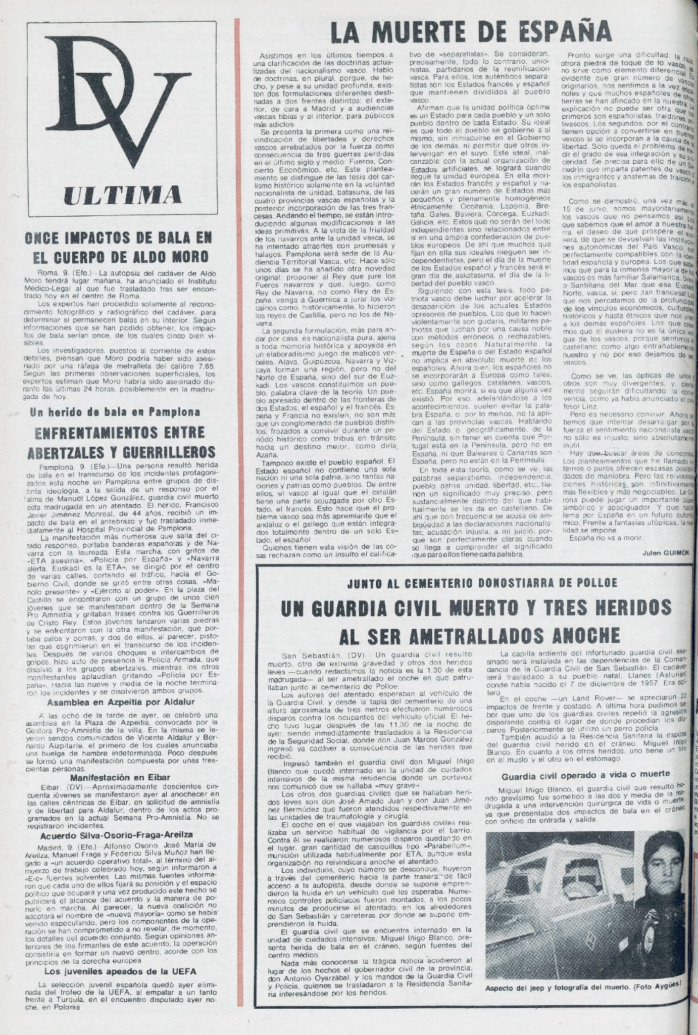 La noche de ese mismo 9 de mayo de 1978 la banda terrorista ETA ametralló un Land Rover de la Guardia Civil que prestaba servicio de protección al acuartelamiento de Intxaurrondo en San Sebastián. El vehículo, con cuatro agentes en su interior, realizaba una patrulla por los alrededores de las dependencias de la Guardia Civil. Al pasar por las cercanías del cementerio de Polloe, el Land Rover fue ametrallado por dos terroristas que dispararon desde una tapia de unos tres metros de altura que se encuentra junto a la carretera. Como consecuencia del tiroteo resultaron gravemente heridos el conductor del vehículo, JUAN MARCOS GONZÁLEZ, que fallecería poco después de ingresar en un centro sanitario, y Miguel Ángel Íñigo Blanco, que lo haría seis días después, el 15 de mayo.